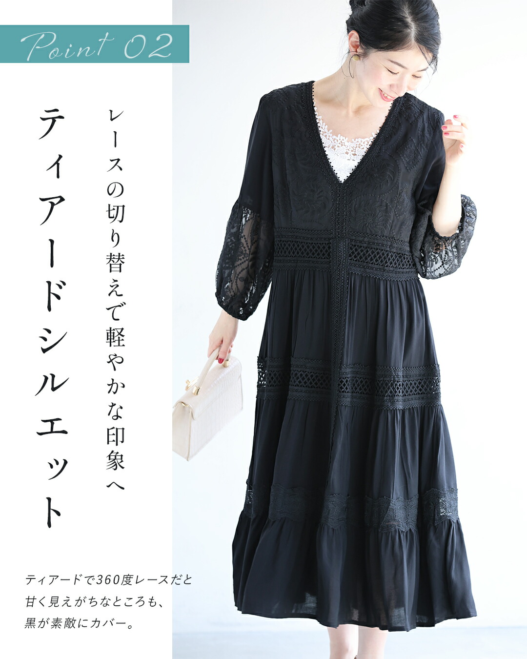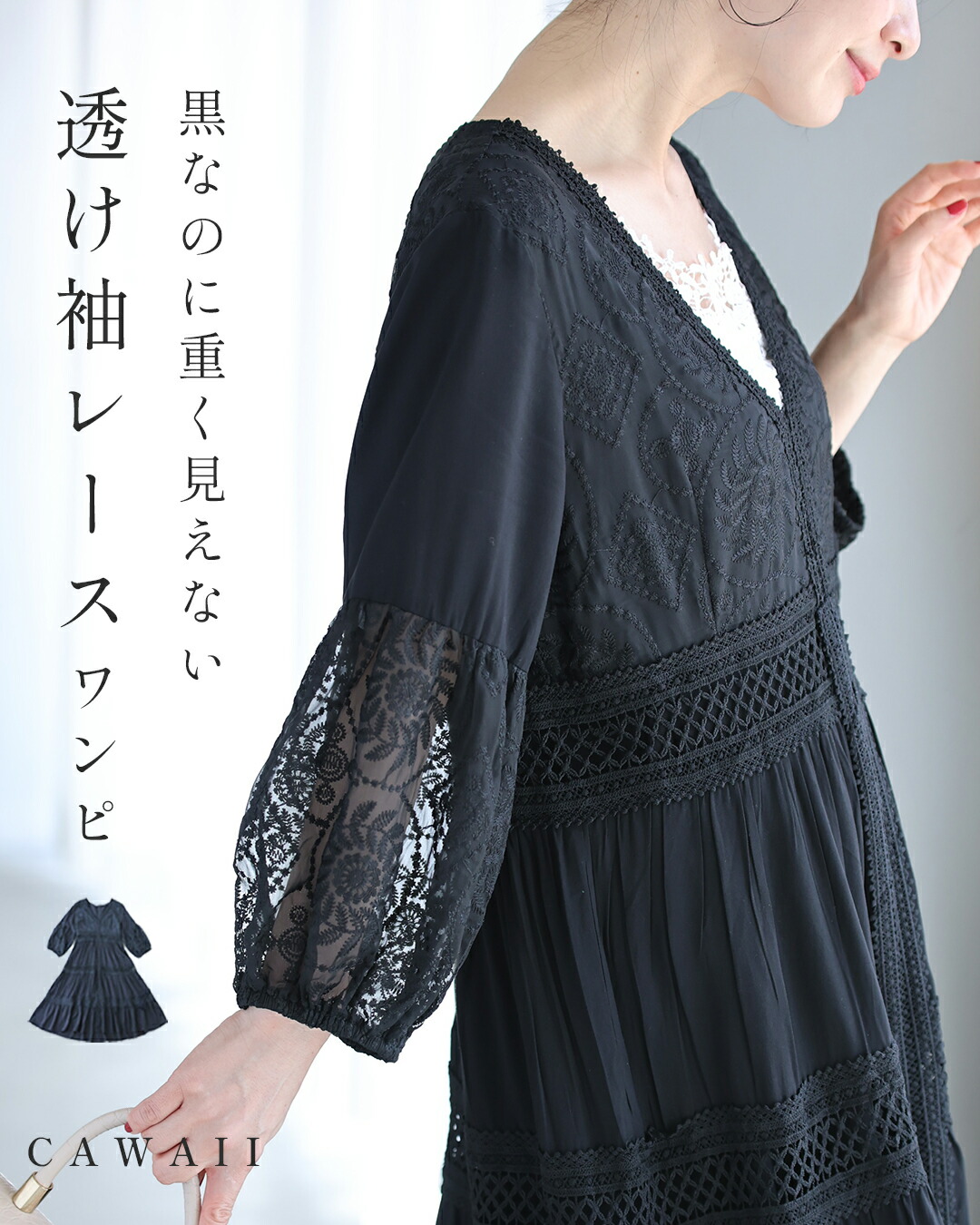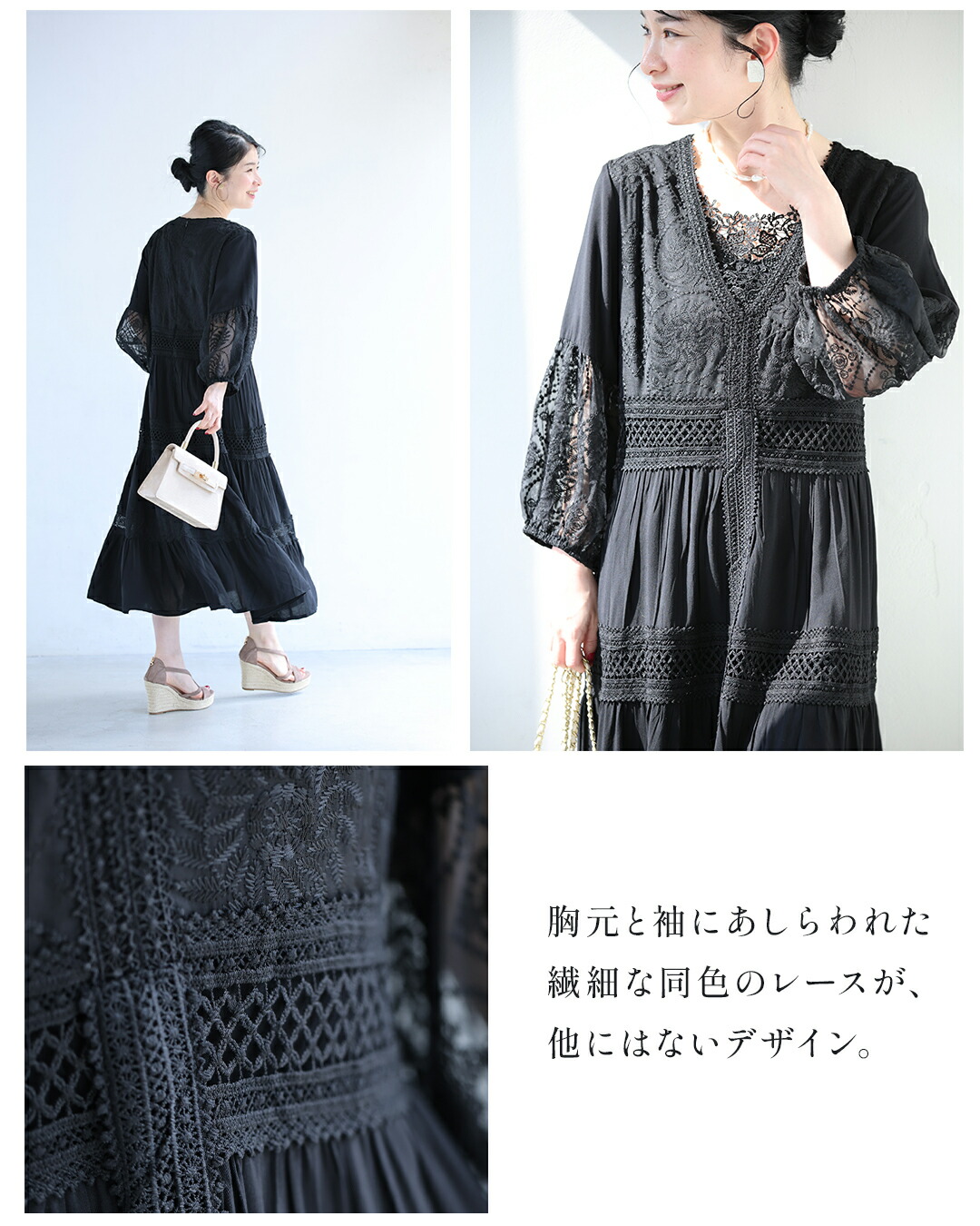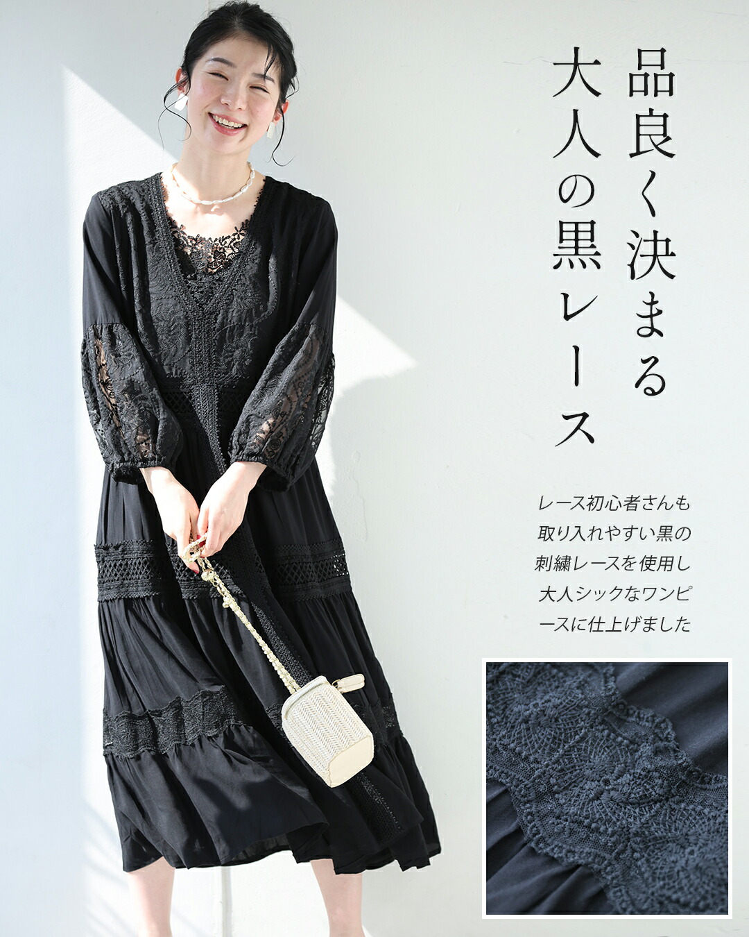 w61170ps 新作 新着 再入荷 CAWAII FRENCHPAVE フレンチパヴェ エレガント ベーシック カジュアル 可愛い かわいい カワイイ おしゃれ オシャレ お洒落 個性 個性的 定番 ベーシック 大人かわいい 大人可愛い 上品 女性らしい デザイン スタンダード ナチュラル きれいめ キレイめ シンプル フェミニン レディース レディースファッション 大人 ママ ミセス 30代 40代 50代 60代 大人旅 南国巡る 刺繍 ワンピ 9分袖 九分袖 8分袖 八分袖 半端袖 ぽわん袖 Vネック ティアード ふんわり 透け感 メリハリ スッキリ見え Sサイズ Mサイズ Lサイズ 2Lサイズ フリーサイズ フリー 小さめ 小さめサイズ小さい 小さいサイズ 低身長 痩せ ほっそり 小柄 細身 標準サイズ 大きめシルエット 大きい 大きめ ビッグシルエット ぽっちゃり F サイズ自由 春 夏 秋 春服 春物 夏服 夏物 薄手 涼しい ずずしい 楽ちん 楽チン ラクラク 楽々 ブラック 黒 黒色 ワンカラー ワントーン 刺繍 レース レース服 日常着 普段着 日常使い おでかけ リゾート サマードレス サンドレス 旅行 女子会