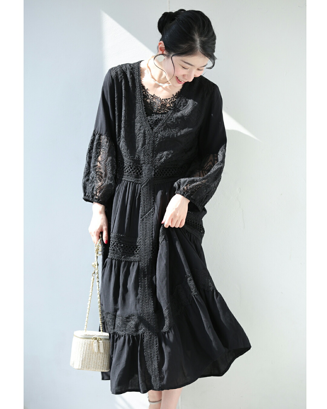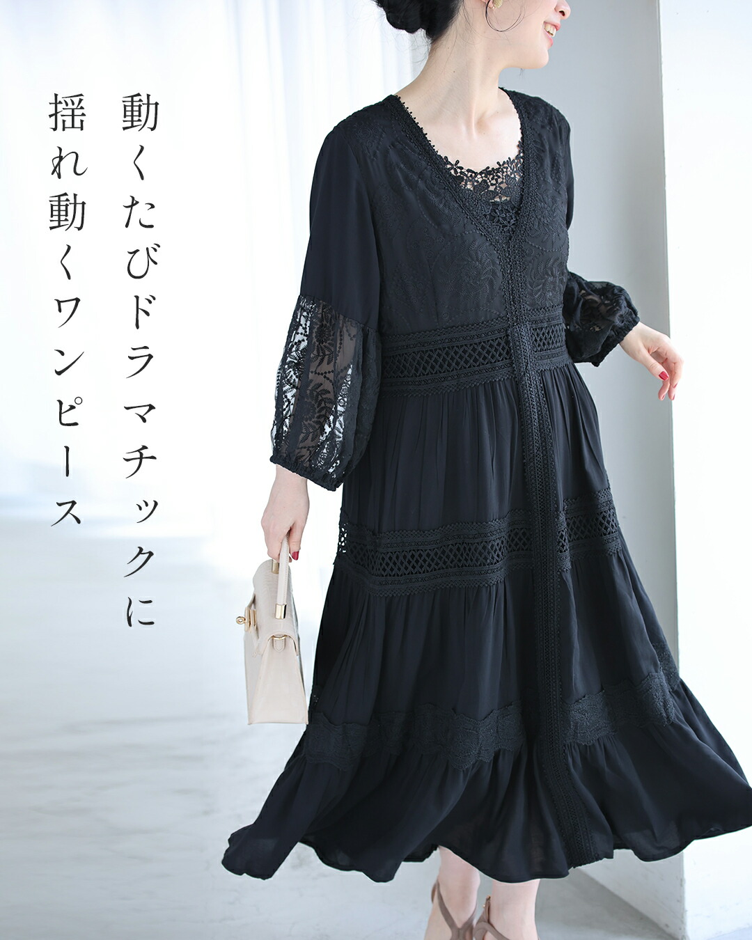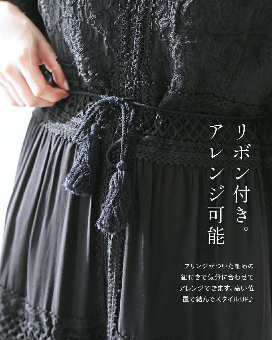 w61170ps 新作 新着 再入荷 CAWAII FRENCHPAVE フレンチパヴェ エレガント ベーシック カジュアル 可愛い かわいい カワイイ おしゃれ オシャレ お洒落 個性 個性的 定番 ベーシック 大人かわいい 大人可愛い 上品 女性らしい デザイン スタンダード ナチュラル きれいめ キレイめ シンプル フェミニン レディース レディースファッション 大人 ママ ミセス 30代 40代 50代 60代 大人旅 南国巡る 刺繍 ワンピ 9分袖 九分袖 8分袖 八分袖 半端袖 ぽわん袖 Vネック ティアード ふんわり 透け感 メリハリ スッキリ見え Sサイズ Mサイズ Lサイズ 2Lサイズ フリーサイズ フリー 小さめ 小さめサイズ小さい 小さいサイズ 低身長 痩せ ほっそり 小柄 細身 標準サイズ 大きめシルエット 大きい 大きめ ビッグシルエット ぽっちゃり F サイズ自由 春 夏 秋 春服 春物 夏服 夏物 薄手 涼しい ずずしい 楽ちん 楽チン ラクラク 楽々 ブラック 黒 黒色 ワンカラー ワントーン 刺繍 レース レース服 日常着 普段着 日常使い おでかけ リゾート サマードレス サンドレス 旅行 女子会