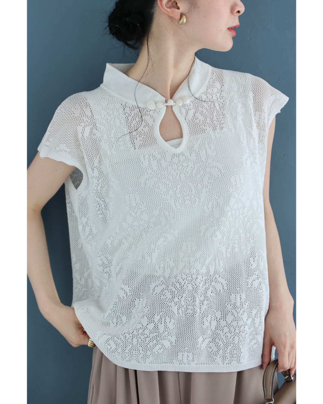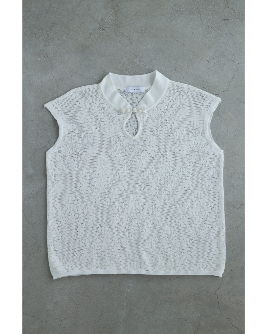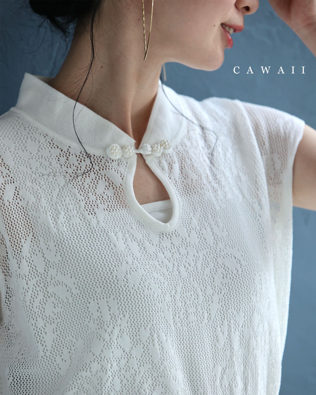 w61224ps 新作 新着 再入荷 CAWAII FRENCHPAVE フレンチパヴェ エレガント ベーシック カジュアル 可愛い かわいい カワイイ おしゃれ オシャレ お洒落 個性 個性的 定番 ベーシック 大人かわいい 大人可愛い 上品 女性らしい デザイン スタンダード ナチュラル きれいめ キレイめ シンプル フェミニン レディース レディースファッション 大人 ママ ミセス 30代 40代 50代 60代 アジアンデザイン 首元 メッシュ カットソー トップス ノースリ ノースリーブ 袖なし フレンチスリーブ チャイナカラー チャイナボタン ワンポイント サマーニット 透かし編み 透け感 短め丈 短丈 スッキリ見え スタイルアップ効果 ワンサイズ S M L フリーサイズ フリー 小さめ 小さいサイズ 低身長 痩せ ほっそり 小柄 細身 標準サイズ ゆったり F サイズ自由 薄手 涼感性 涼しい ずずしい 春 夏 春服 春物 夏 夏服 夏物 着回し 重ね着 レイヤード ストレッチ 伸びる 伸縮性 軽やか 軽量 楽ちん 楽チン ラクラク 楽々 ホワイト 白 白色 柄 総柄 普段着 日常使い おでかけ 旅行 女子会