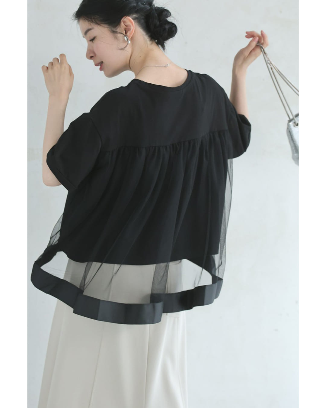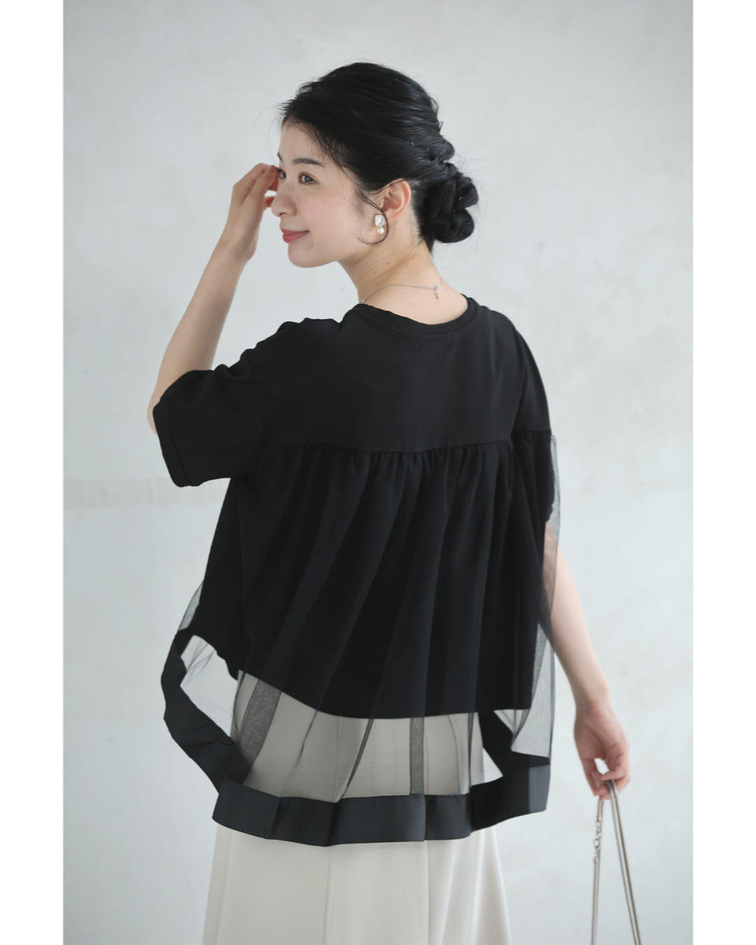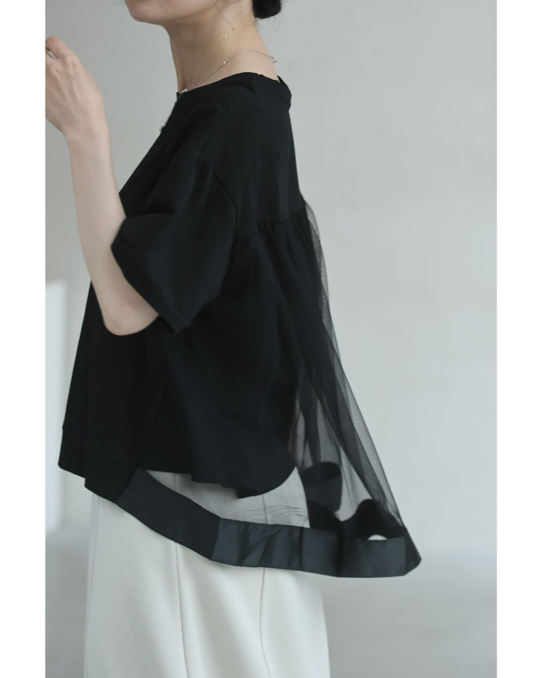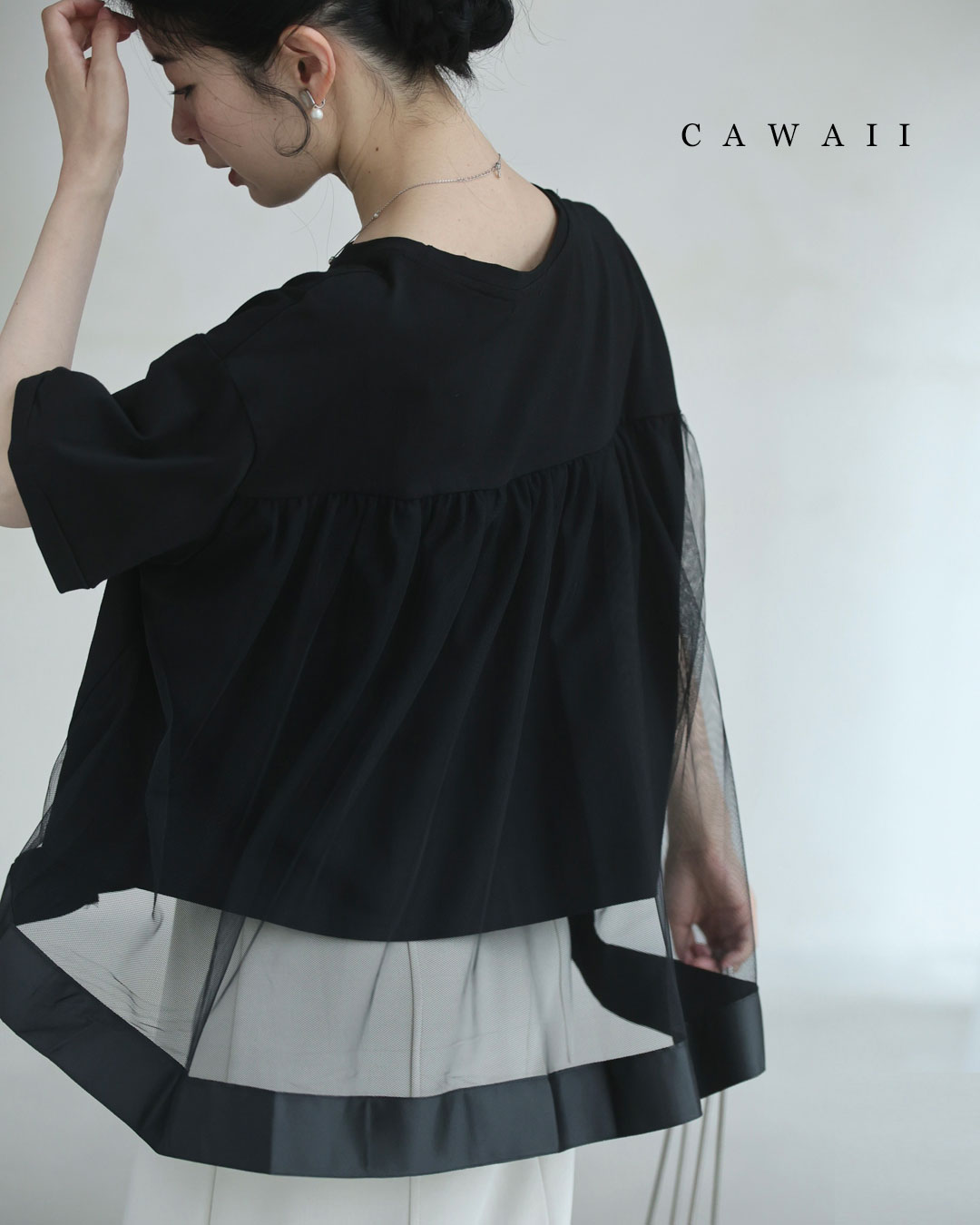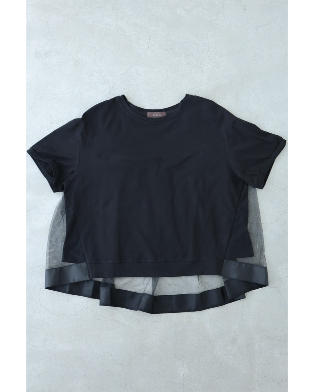 w61337ps 新作 新着 再入荷 CAWAII FRENCHPAVE フレンチパヴェ エレガント ベーシック カジュアル 可愛い かわいい カワイイ おしゃれ オシャレ お洒落 個性 個性的 定番 ベーシック 大人かわいい 大人可愛い 上品 女性らしい デザイン スタンダード ナチュラル きれいめ キレイめ シンプル フェミニン レディース レディースファッション 大人 ママ ミセス 30代 40代 50代 60代 黒 後ろ下がり ベール Tシャツ トップス 半袖 丸首 クルーネック 前上がり チュール生地 抜け感 S M L 2L フリーサイズ フリー 小さめ 小さめサイズ小さい 小さいサイズ 低身長 痩せ ほっそり 小柄 細身 標準サイズ 大きめシルエット 大きい 大きめ ビッグシルエット ぽっちゃり F サイズ自由 薄手 涼感性 涼しい ずずしい 春 夏 春服 春物 夏服 夏物 大人女子 楽ちん 楽チン ラクラク 楽々 伸縮 ストレッチ ブラック 黒色 無地 ワンカラー ワントーン 普段着 日常使い オフィスカジュアル 会社 通勤 OL おでかけ 旅行 女子会 買い物 デート