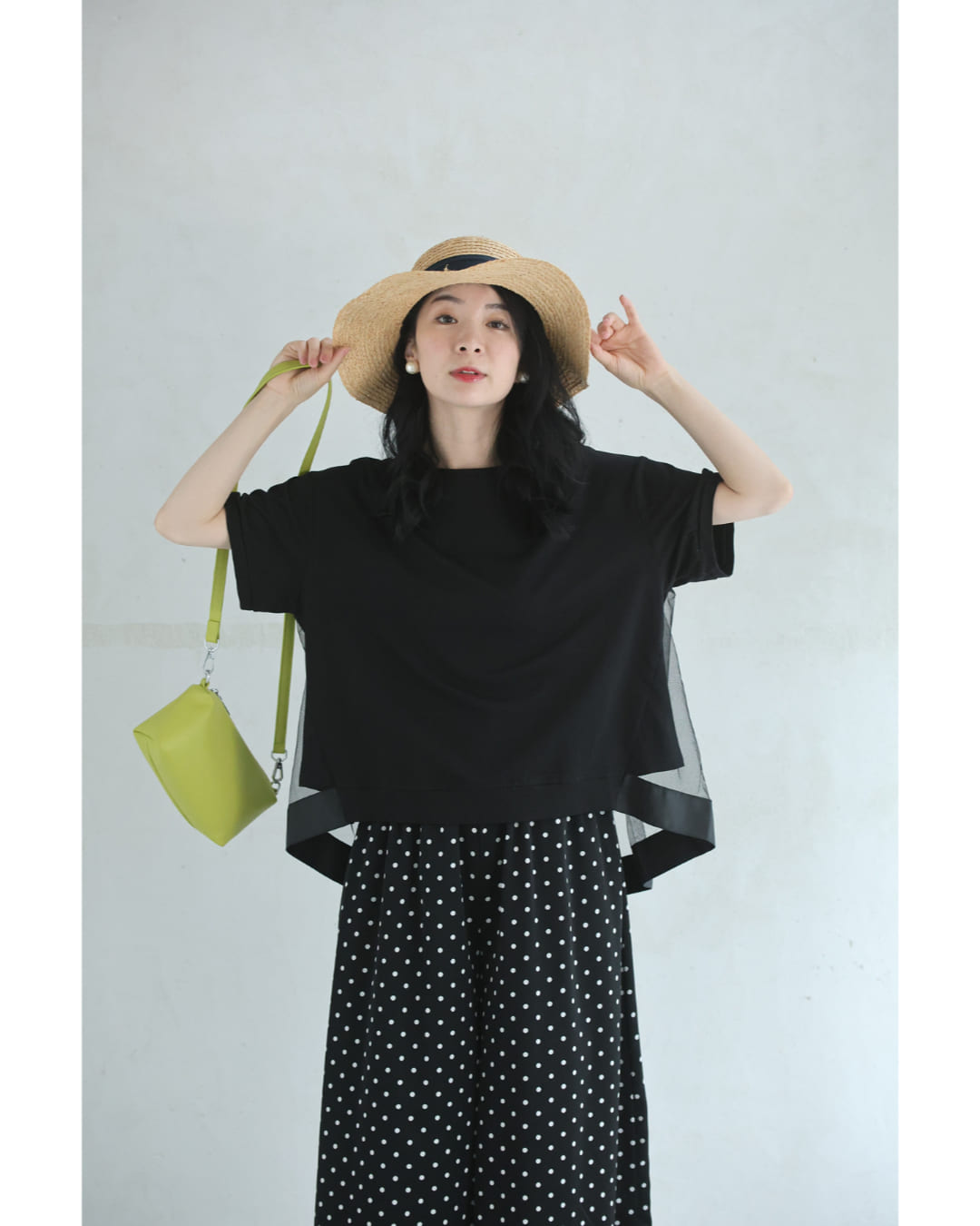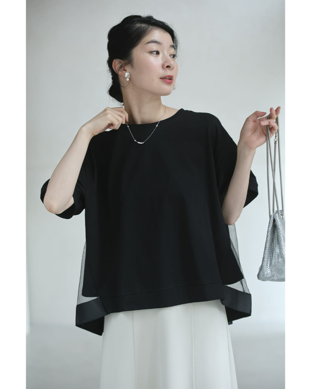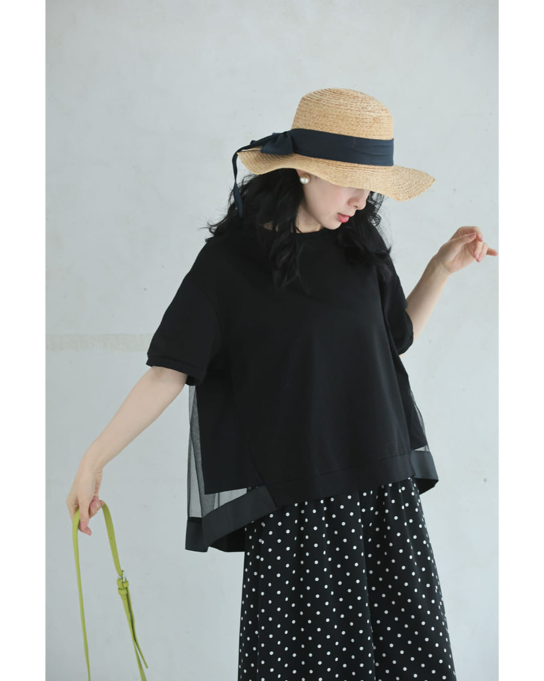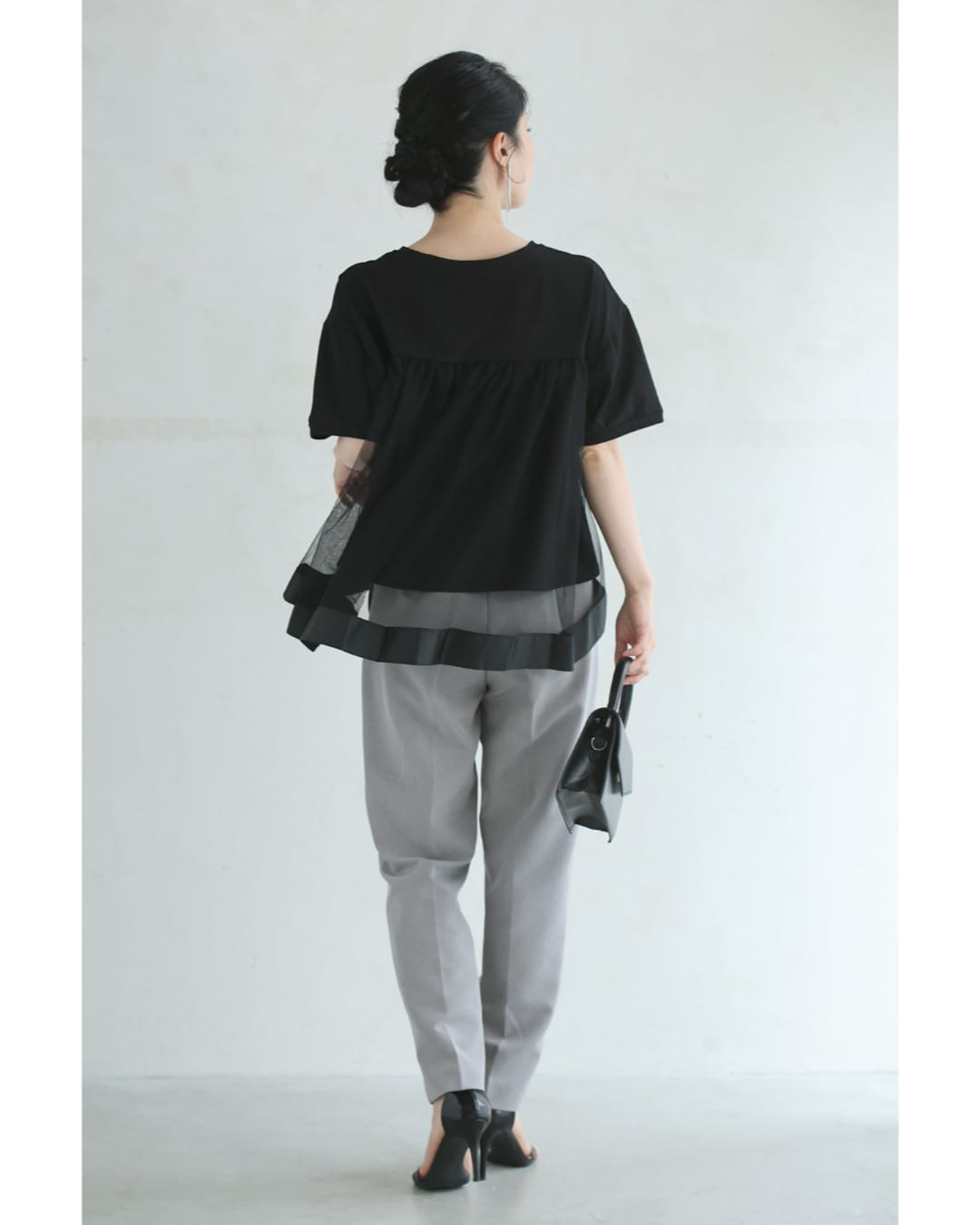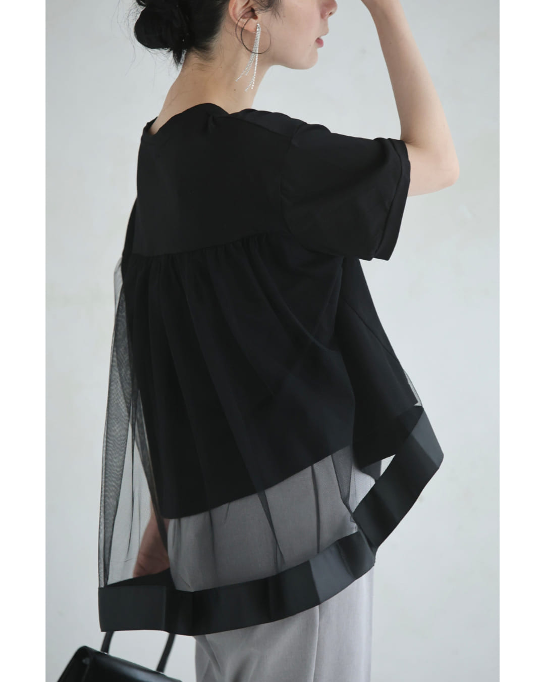 w61337ps 新作 新着 再入荷 CAWAII FRENCHPAVE フレンチパヴェ エレガント ベーシック カジュアル 可愛い かわいい カワイイ おしゃれ オシャレ お洒落 個性 個性的 定番 ベーシック 大人かわいい 大人可愛い 上品 女性らしい デザイン スタンダード ナチュラル きれいめ キレイめ シンプル フェミニン レディース レディースファッション 大人 ママ ミセス 30代 40代 50代 60代 黒 後ろ下がり ベール Tシャツ トップス 半袖 丸首 クルーネック 前上がり チュール生地 抜け感 S M L 2L フリーサイズ フリー 小さめ 小さめサイズ小さい 小さいサイズ 低身長 痩せ ほっそり 小柄 細身 標準サイズ 大きめシルエット 大きい 大きめ ビッグシルエット ぽっちゃり F サイズ自由 薄手 涼感性 涼しい ずずしい 春 夏 春服 春物 夏服 夏物 大人女子 楽ちん 楽チン ラクラク 楽々 伸縮 ストレッチ ブラック 黒色 無地 ワンカラー ワントーン 普段着 日常使い オフィスカジュアル 会社 通勤 OL おでかけ 旅行 女子会 買い物 デート