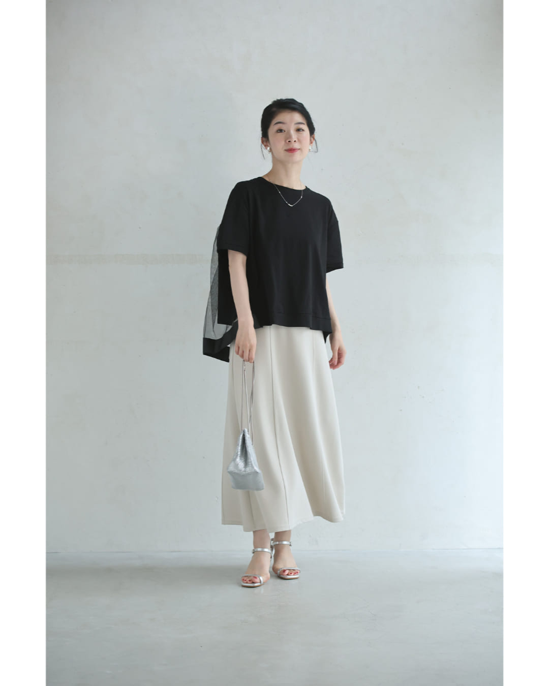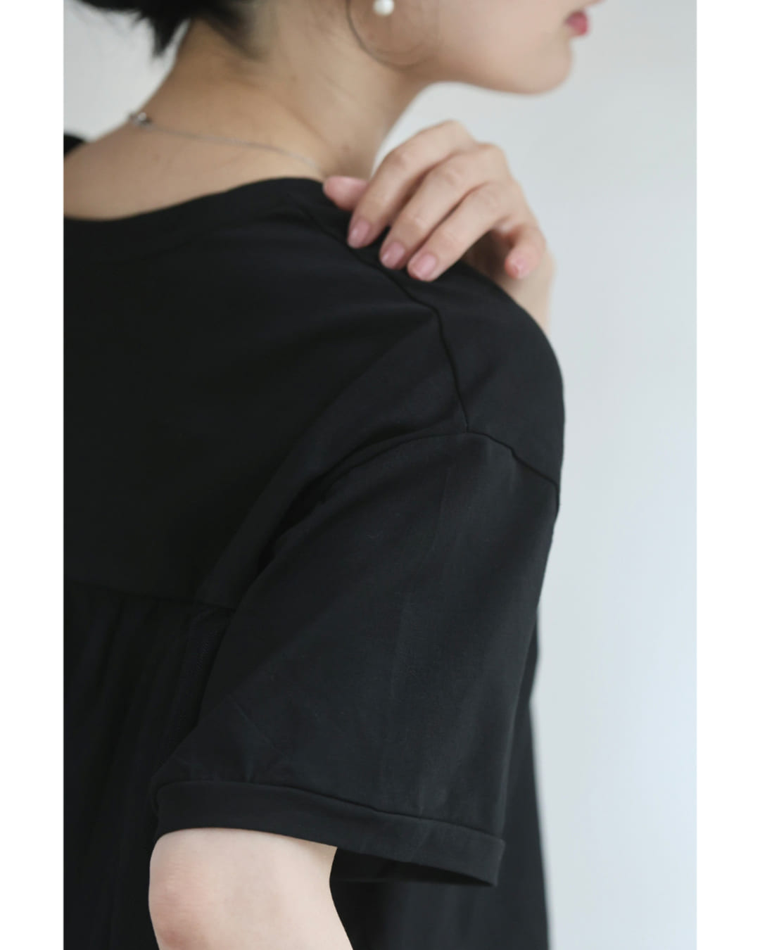 Sから2L対応 黒 後ろ下がりベールのTシャツトップス