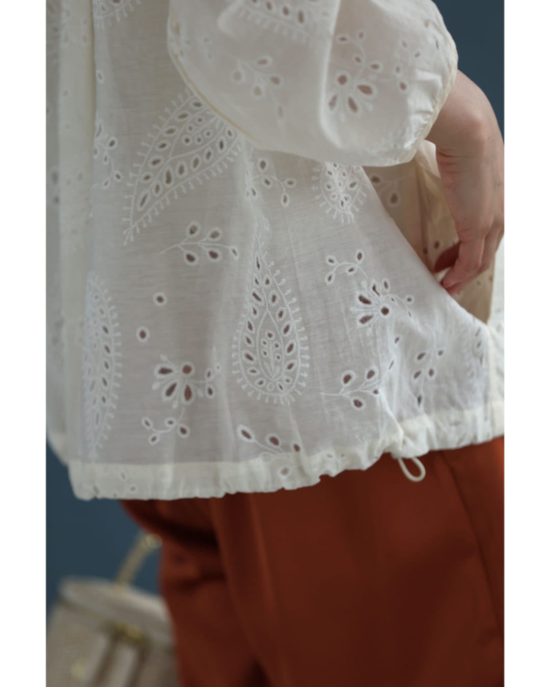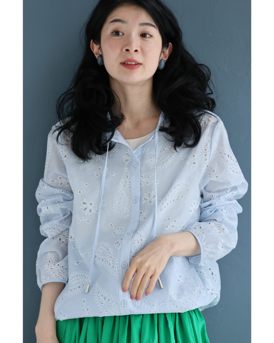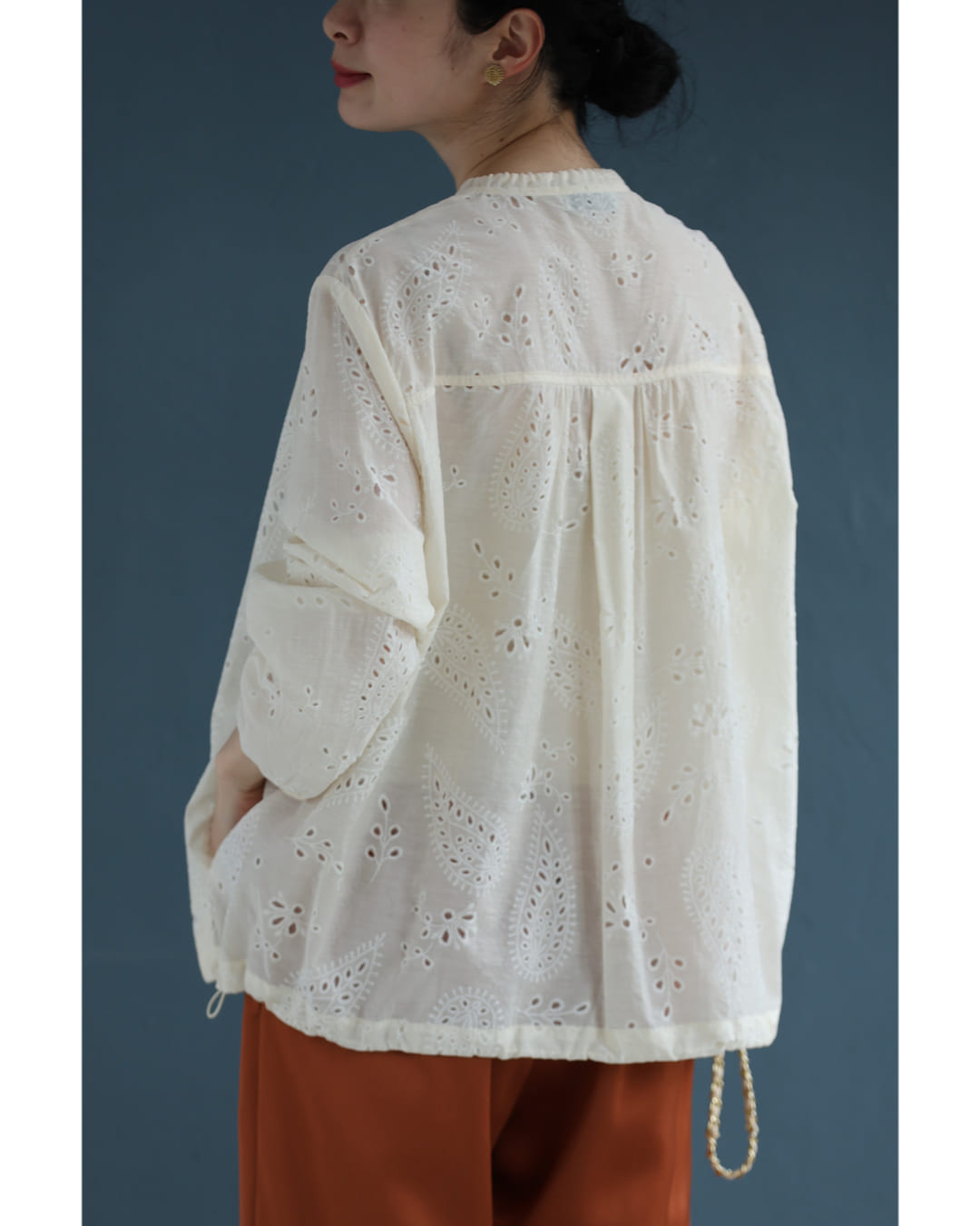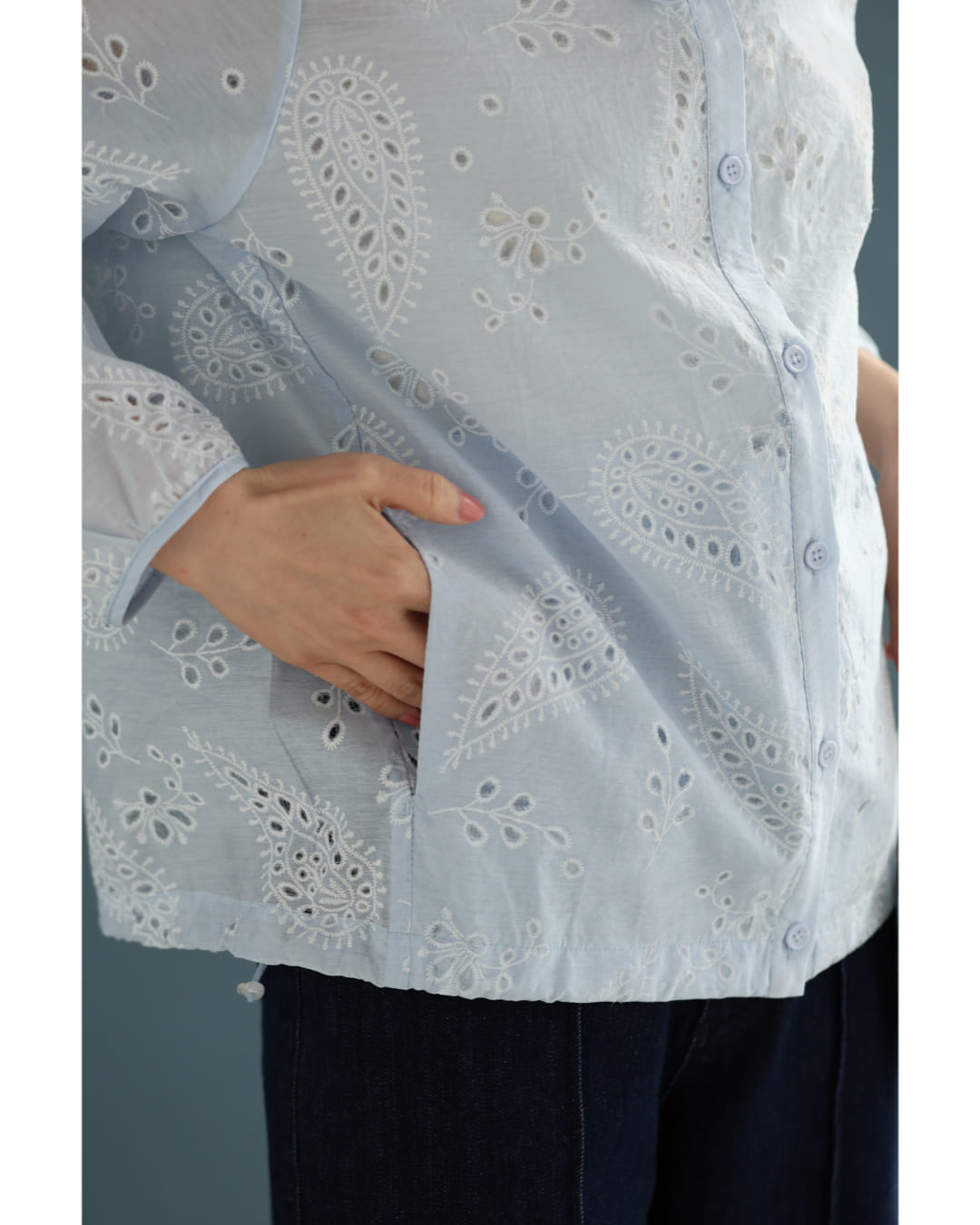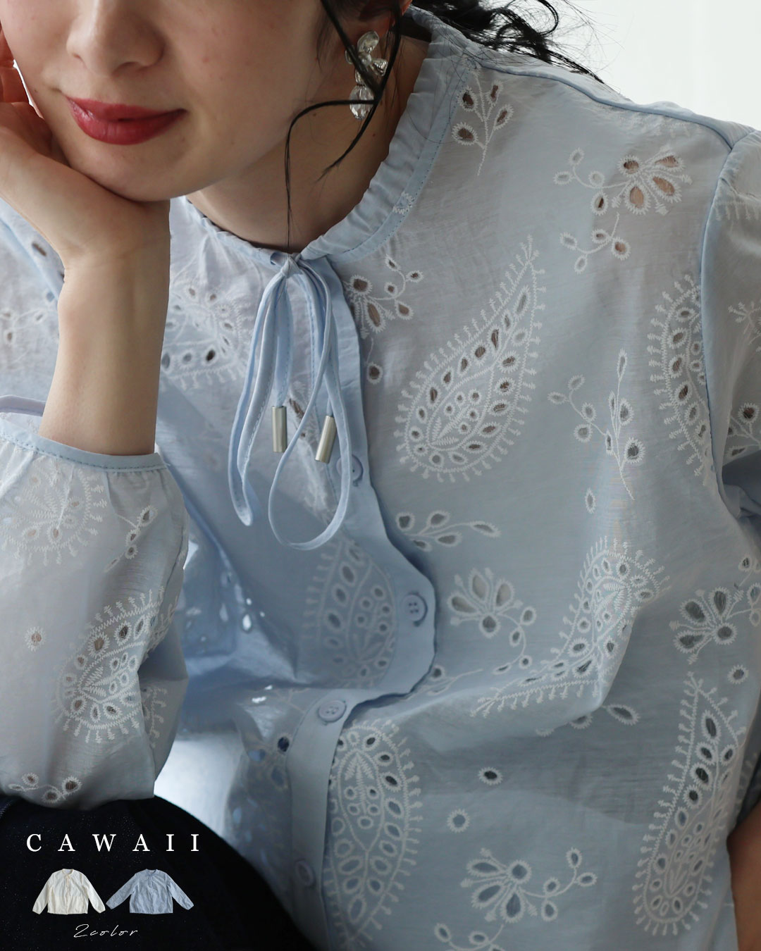 w61387ps 新作 新着 再入荷 CAWAII FRENCHPAVE フレンチパヴェ エレガント ベーシック カジュアル 可愛い かわいい カワイイ おしゃれ オシャレ お洒落 個性 個性的 定番 ベーシック 大人かわいい 大人可愛い 上品 女性らしい デザイン スタンダード ナチュラル きれいめ キレイめ シンプル フェミニン レディース レディースファッション 大人 ママ ミセス 30代 40代 50代 60代 ペイズリー浮かぶパンチングレースシャツトップス 長袖 S M L XL 3L ワンサイズ フリー 小さめ 小さい 低身長 痩せ ほっそり 小柄 細身 標準サイズ 大きめシルエット 大きい ビッグシルエット ゆったり F サイズ自由 薄手 涼感性 涼しい ずずしい 春 夏 春服 春物 夏服 夏物 爽やか トレンド 大人女子 体型カバー 楽 アイボリー ブルー 日常使い デイリー 仕事 会社 おでかけ 刺繍 レース 裾コード
