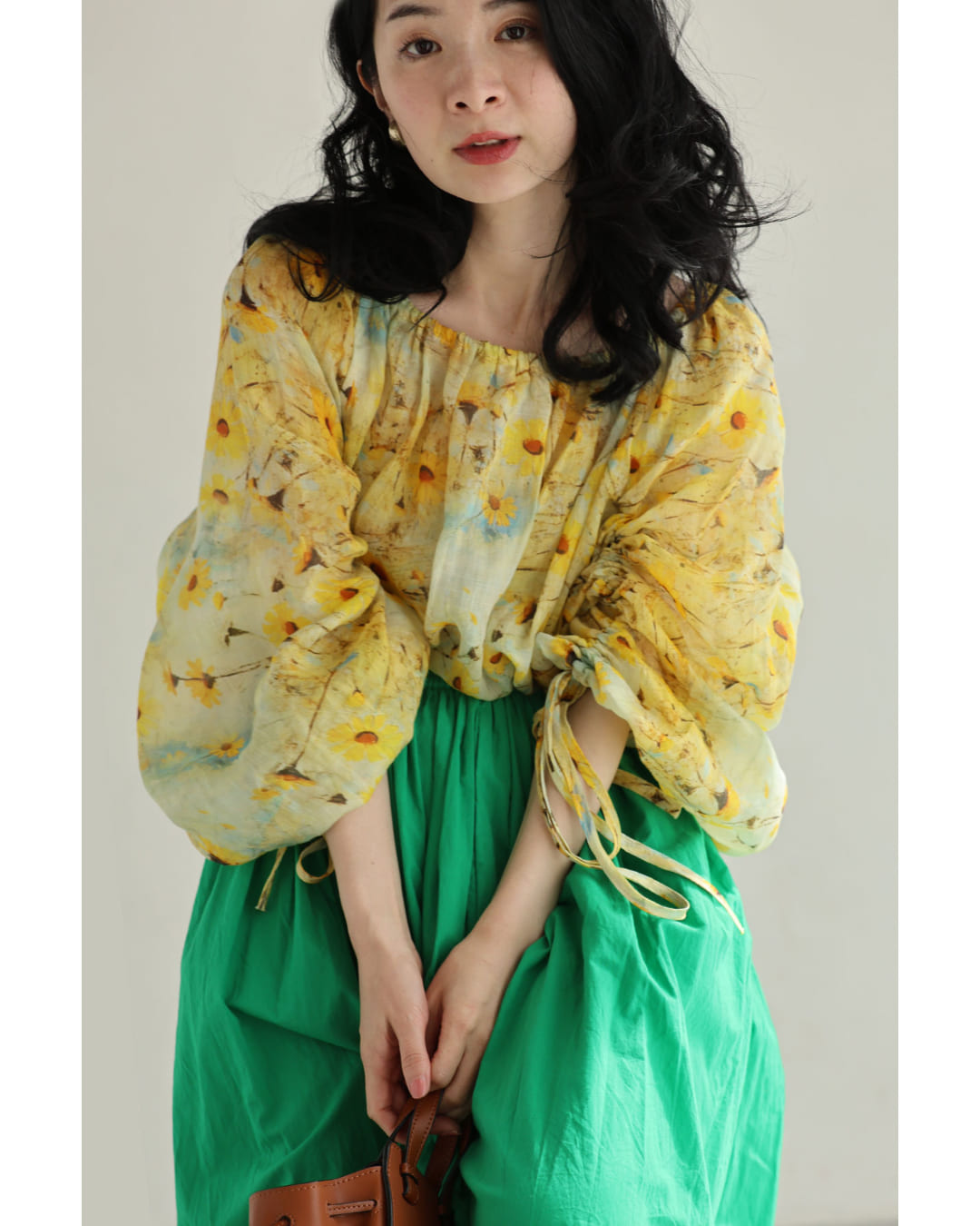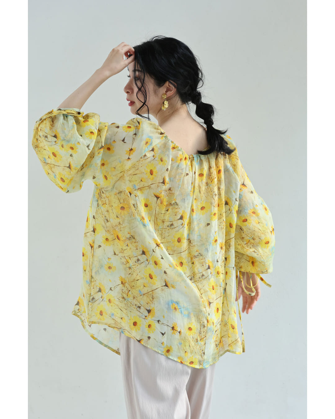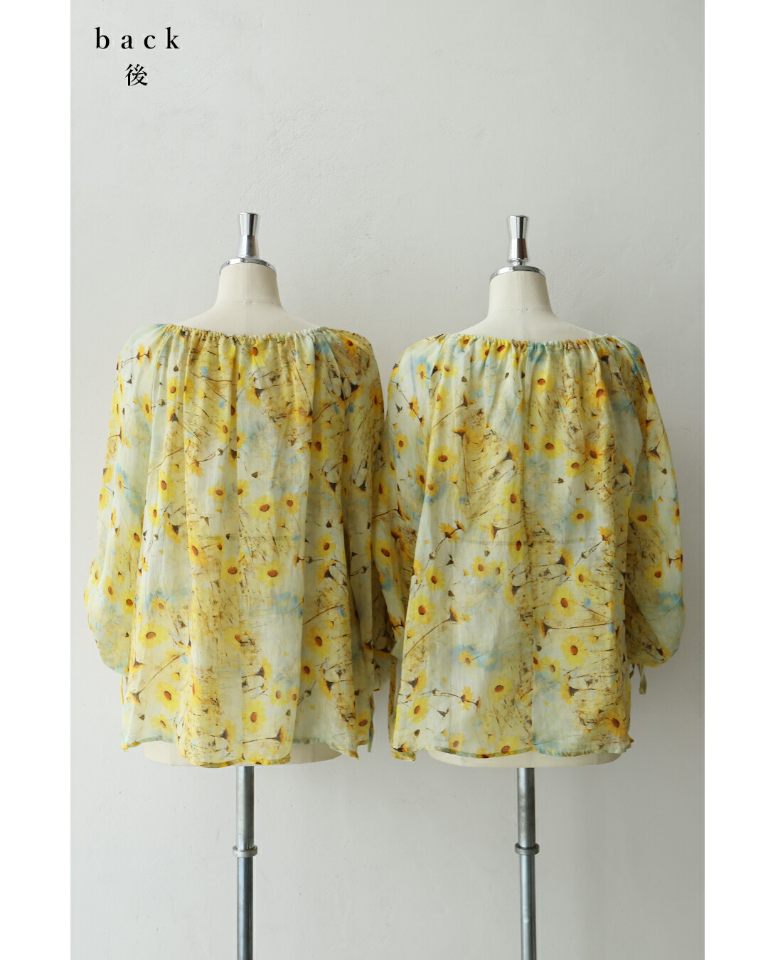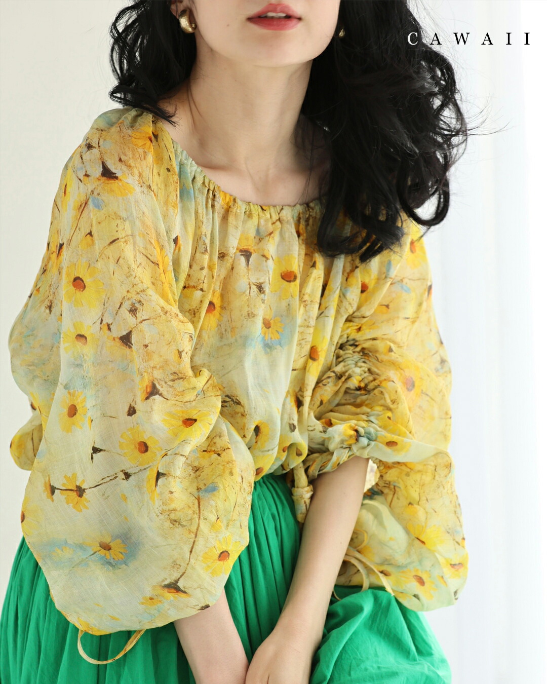 w61511ps 新作 新着 再入荷 CAWAII FRENCHPAVE フレンチパヴェ エレガント ベーシック カジュアル 可愛い かわいい カワイイ おしゃれ オシャレ お洒落 個性 個性的 定番 ベーシック 大人かわいい 大人可愛い 上品 女性らしい デザイン スタンダード ナチュラル きれいめ キレイめ シンプル フェミニン レディース レディースファッション 大人 ママ ミセス 30代 40代 50代 60代 日差しに揺れるマーガレットのシアーブラウストップス 長袖 S M L XL 3L ワンサイズ フリー 小さめ 小さい 低身長 痩せ ほっそり 小柄 細身 標準サイズ 大きめシルエット 大きい ビッグシルエット ゆったり F サイズ自由 薄手 涼感性 涼しい ずずしい 春 夏 春服 春物 夏服 夏物 楽 爽やか ビタミンカラー イエロー 黄 柄 総柄 花 フラワー ガーデン 麻 日常使い デイリー おでかけ リゾート 旅行 デート オフショル