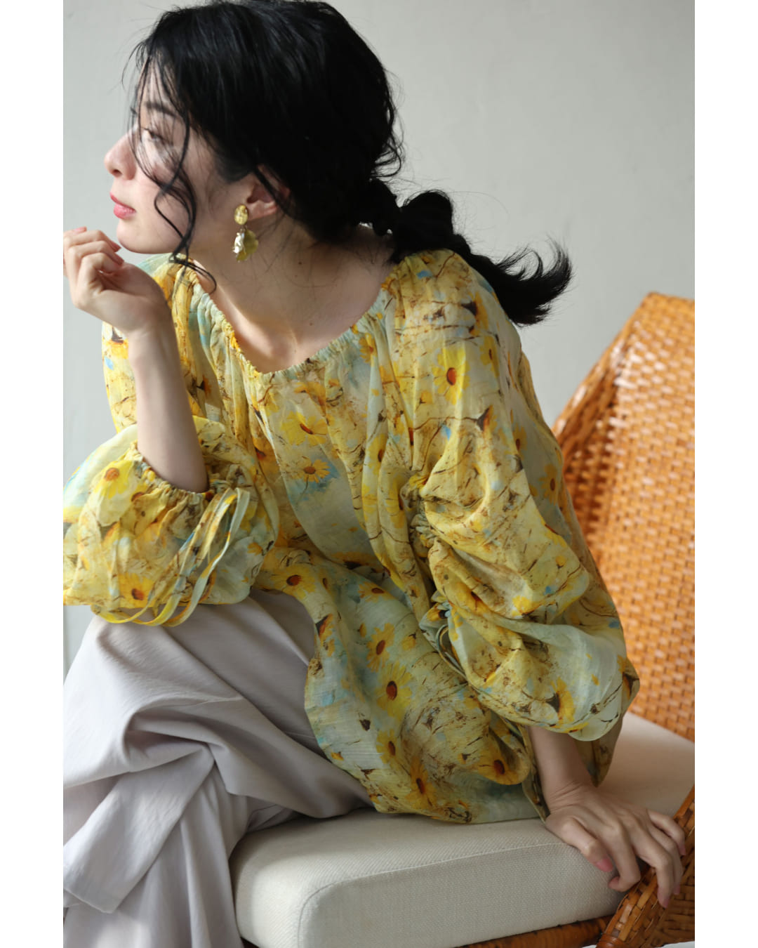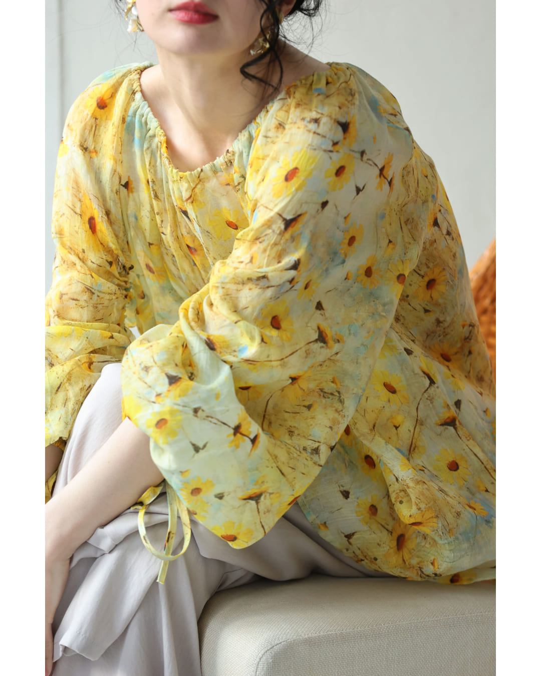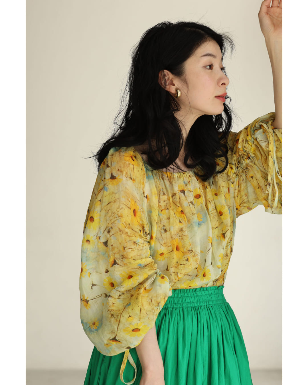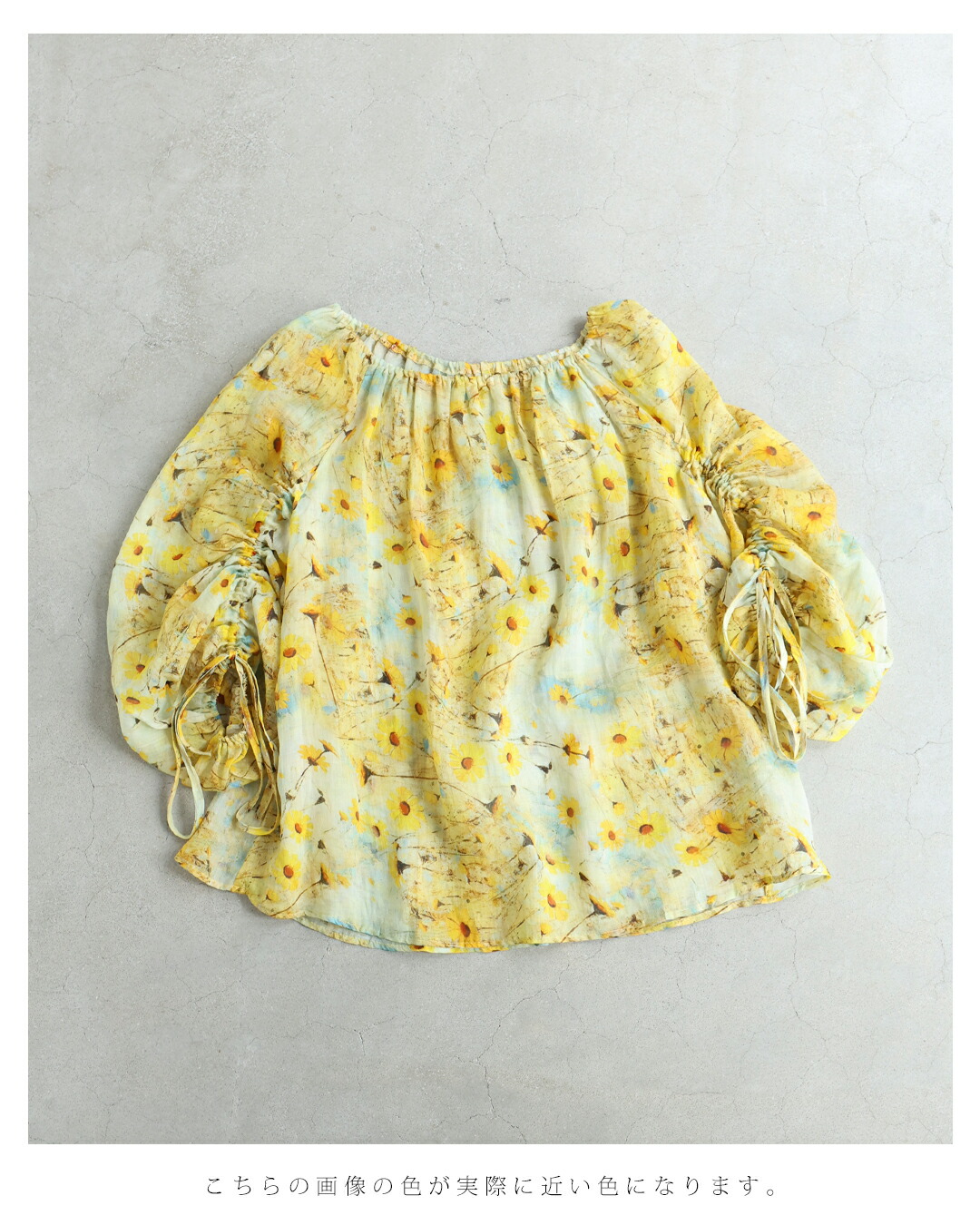 w61511ps 新作 新着 再入荷 CAWAII FRENCHPAVE フレンチパヴェ エレガント ベーシック カジュアル 可愛い かわいい カワイイ おしゃれ オシャレ お洒落 個性 個性的 定番 ベーシック 大人かわいい 大人可愛い 上品 女性らしい デザイン スタンダード ナチュラル きれいめ キレイめ シンプル フェミニン レディース レディースファッション 大人 ママ ミセス 30代 40代 50代 60代 日差しに揺れるマーガレットのシアーブラウストップス 長袖 S M L XL 3L ワンサイズ フリー 小さめ 小さい 低身長 痩せ ほっそり 小柄 細身 標準サイズ 大きめシルエット 大きい ビッグシルエット ゆったり F サイズ自由 薄手 涼感性 涼しい ずずしい 春 夏 春服 春物 夏服 夏物 楽 爽やか ビタミンカラー イエロー 黄 柄 総柄 花 フラワー ガーデン 麻 日常使い デイリー おでかけ リゾート 旅行 デート オフショル
