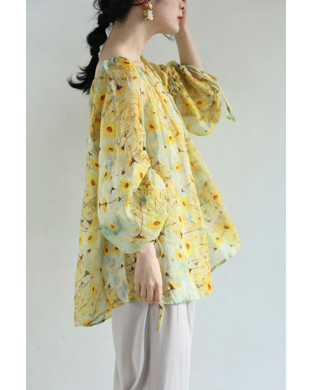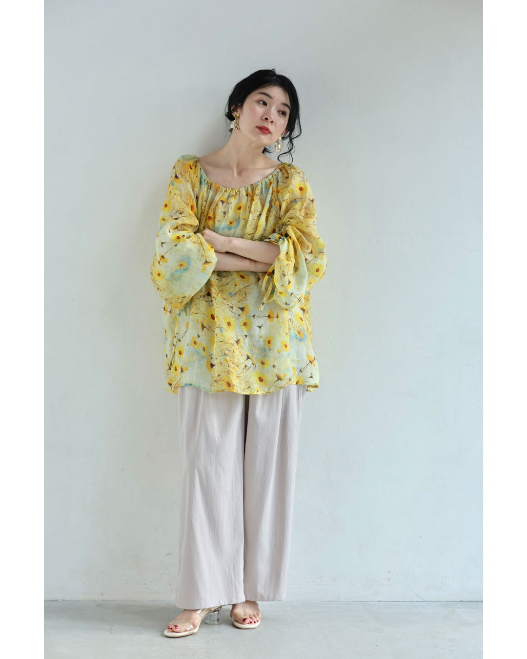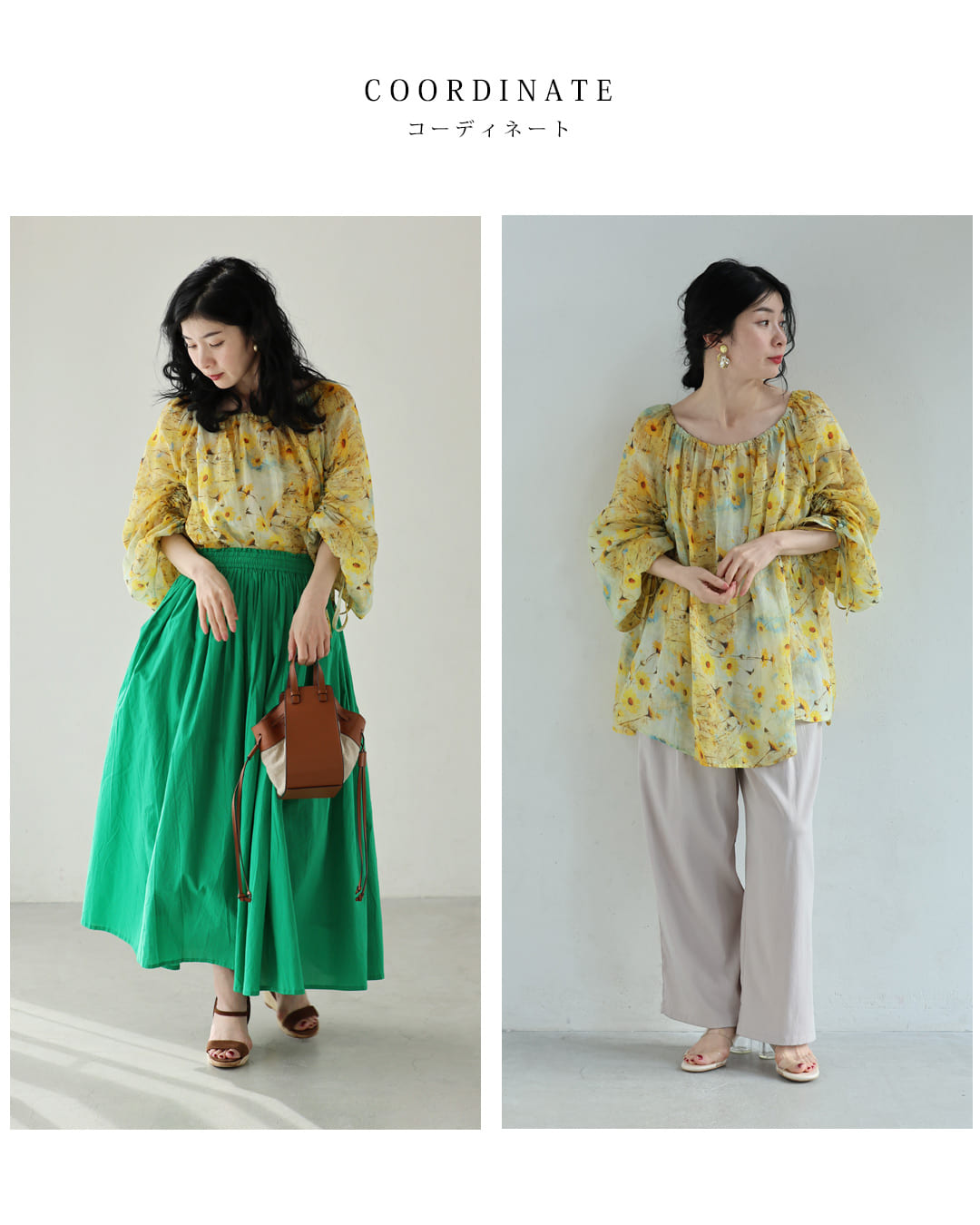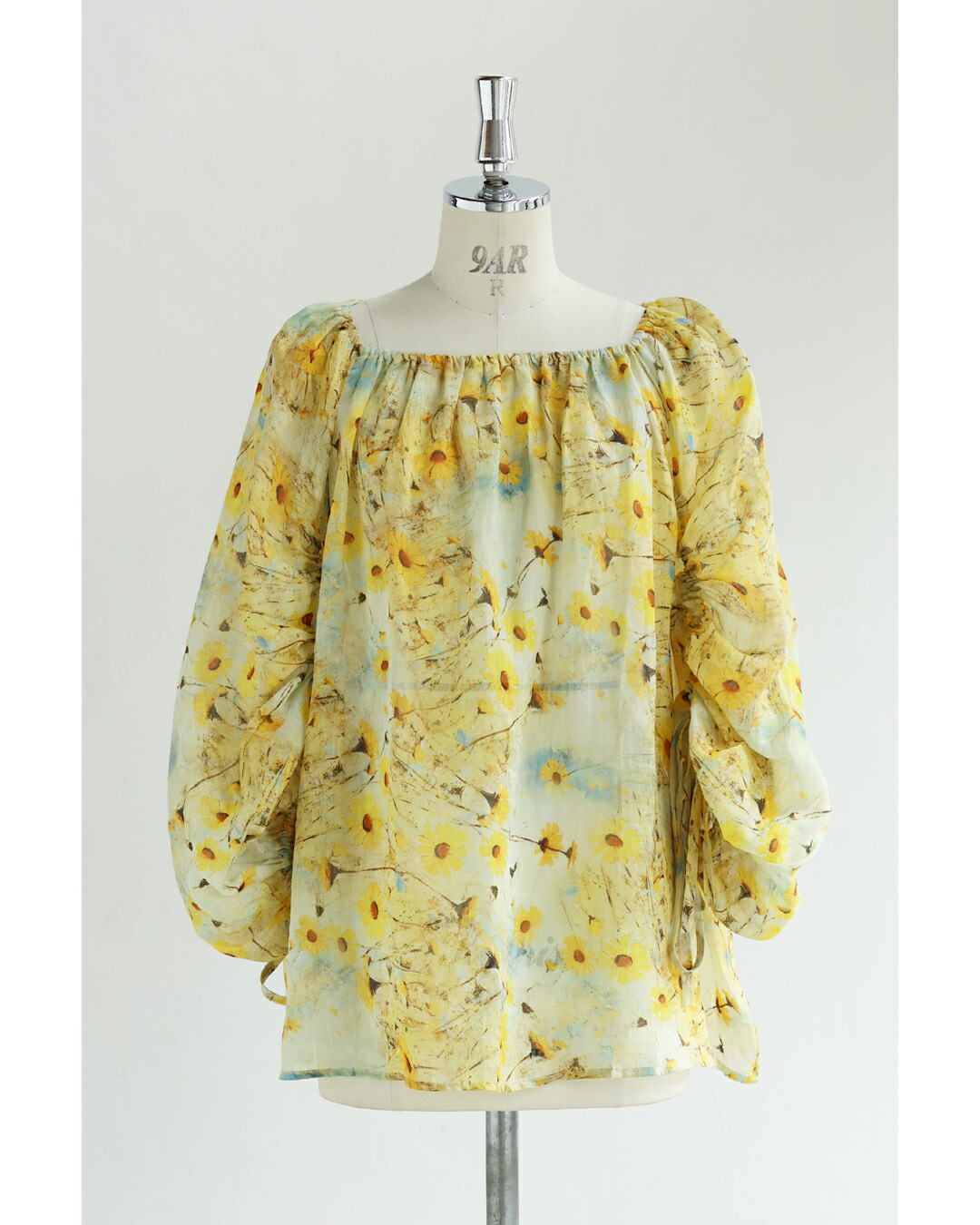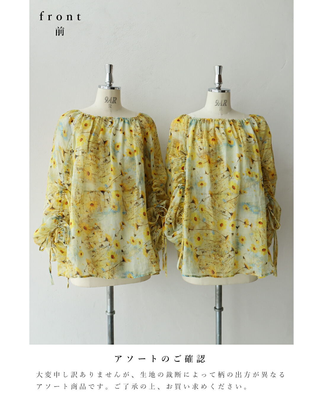 w61511ps 新作 新着 再入荷 CAWAII FRENCHPAVE フレンチパヴェ エレガント ベーシック カジュアル 可愛い かわいい カワイイ おしゃれ オシャレ お洒落 個性 個性的 定番 ベーシック 大人かわいい 大人可愛い 上品 女性らしい デザイン スタンダード ナチュラル きれいめ キレイめ シンプル フェミニン レディース レディースファッション 大人 ママ ミセス 30代 40代 50代 60代 日差しに揺れるマーガレットのシアーブラウストップス 長袖 S M L XL 3L ワンサイズ フリー 小さめ 小さい 低身長 痩せ ほっそり 小柄 細身 標準サイズ 大きめシルエット 大きい ビッグシルエット ゆったり F サイズ自由 薄手 涼感性 涼しい ずずしい 春 夏 春服 春物 夏服 夏物 楽 爽やか ビタミンカラー イエロー 黄 柄 総柄 花 フラワー ガーデン 麻 日常使い デイリー おでかけ リゾート 旅行 デート オフショル