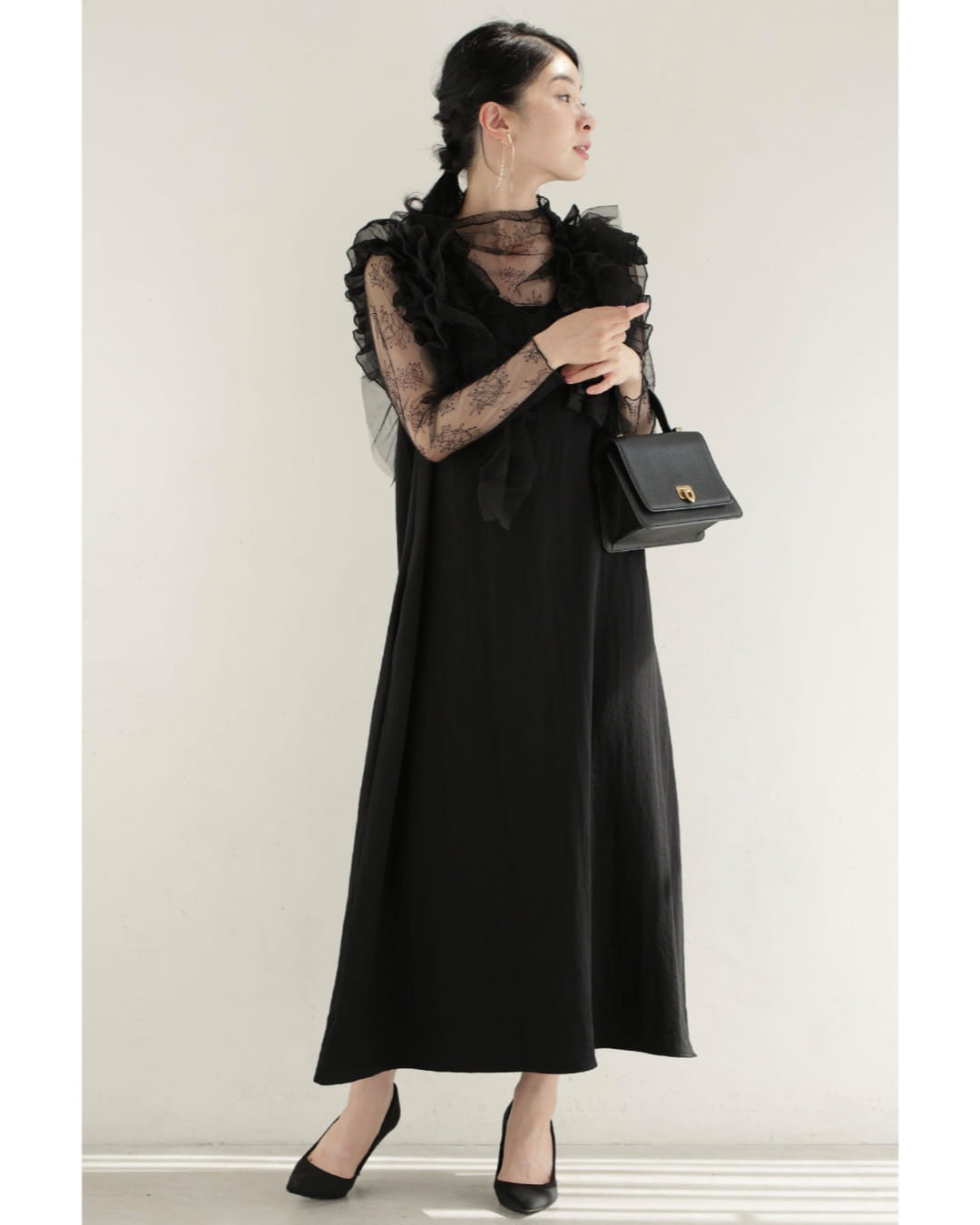 SからM対応 黒 デコレーションチュールのバックリボンミディアムワンピース