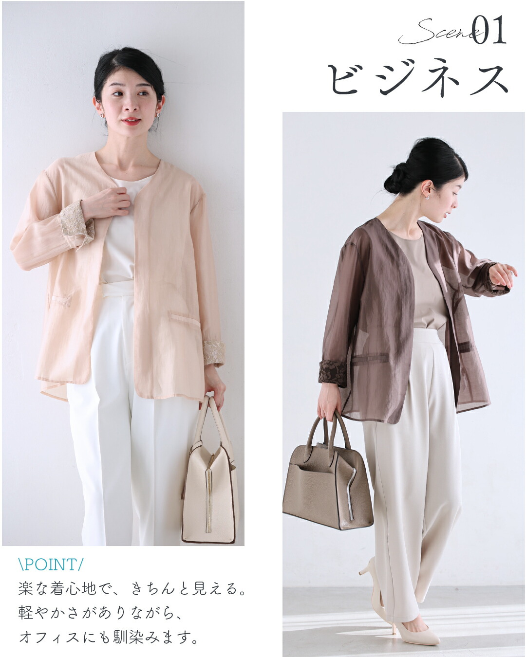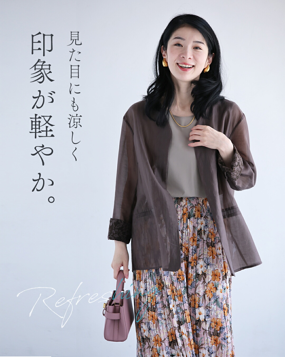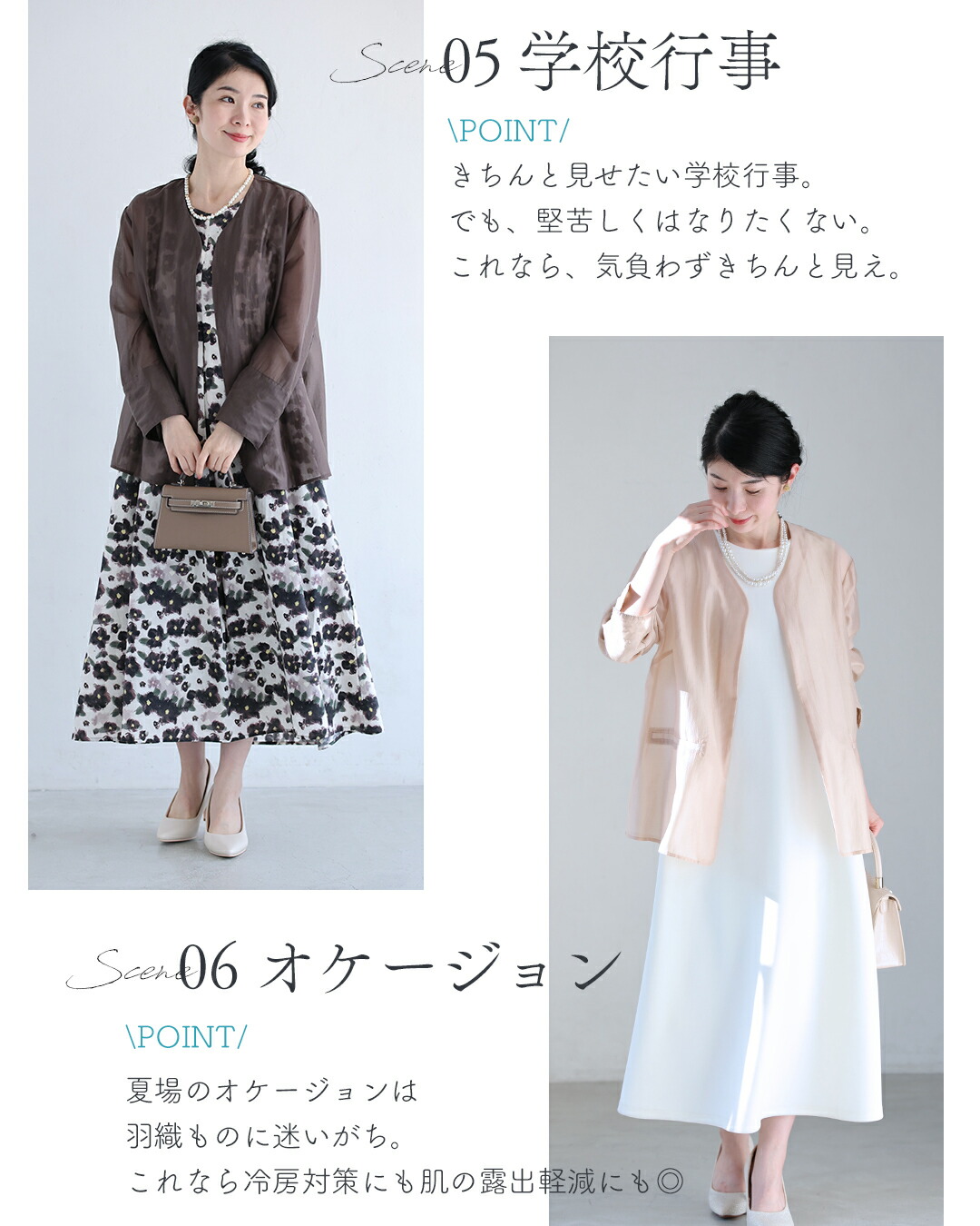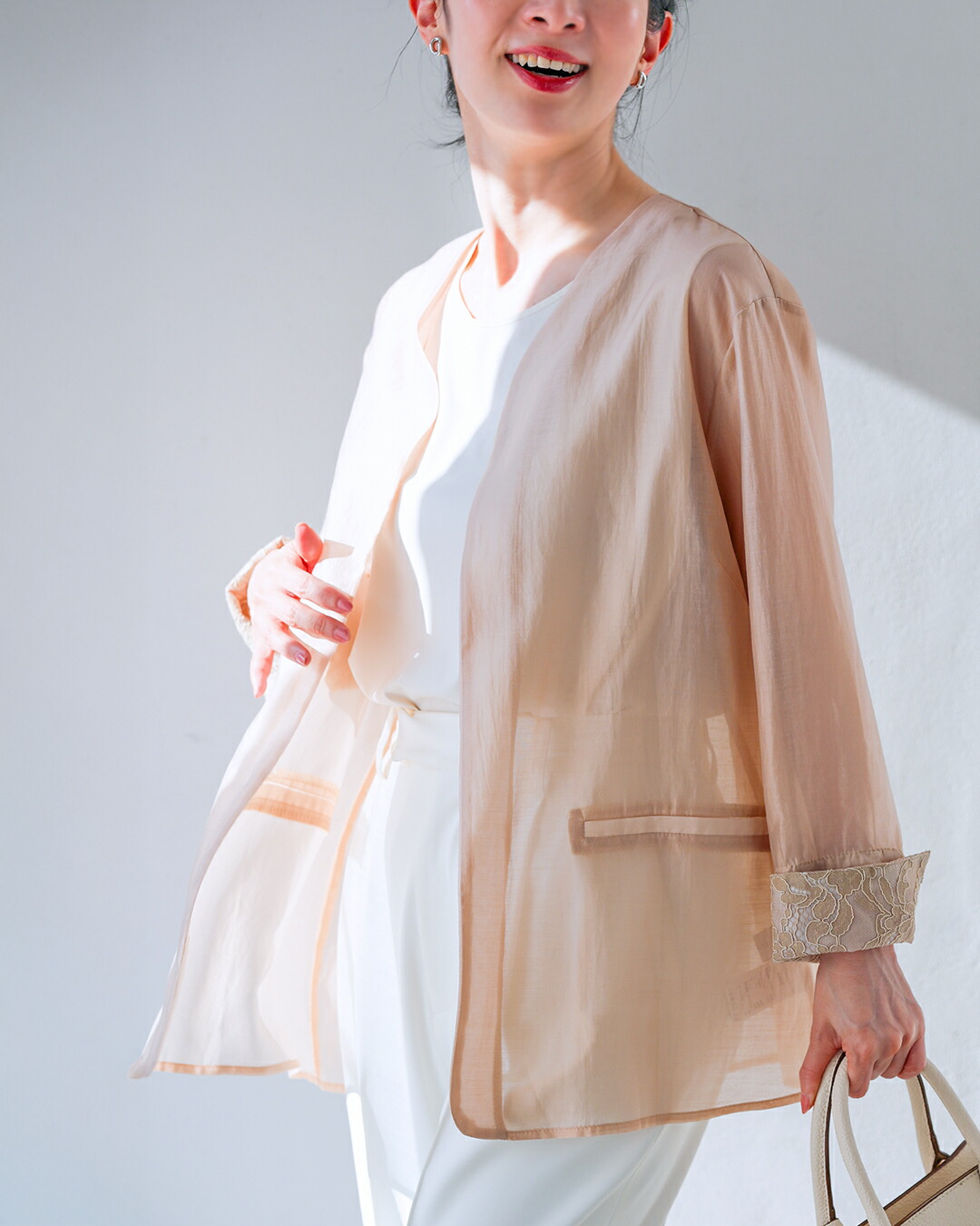 w61620ps 新作 新着 再入荷 CAWAII FRENCHPAVE フレンチパヴェ エレガント ベーシック カジュアル 可愛い かわいい カワイイ おしゃれ オシャレ お洒落 個性 個性的 定番 ベーシック 大人かわいい 大人可愛い 上品 女性らしい デザイン スタンダード ナチュラル きれいめ キレイめ シンプル フェミニン レディース レディースファッション 大人 ママ ミセス 30代 40代 50代 60代 軽ジャケ 薄くて軽くて、きちんと見え アウター 羽織り ブラウン 茶 ベージュ S M L XL 標準サイズ サイズ展開 日常使い ヘビロテ おでかけ 軽やか UVカット 紫外線カット UV対策 紫外線対策 日焼け対策 冷房対策 シアー 光沢感 抜け感