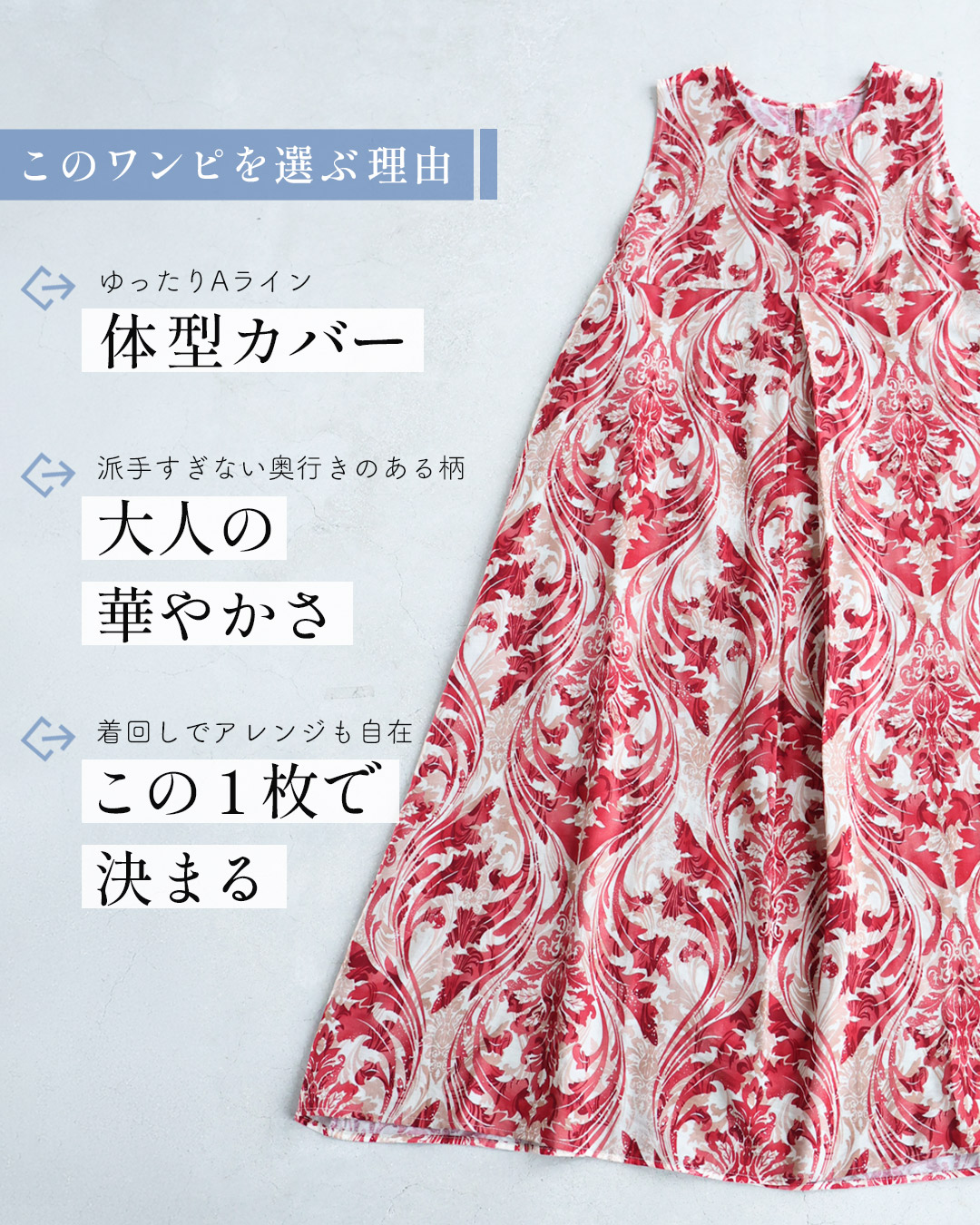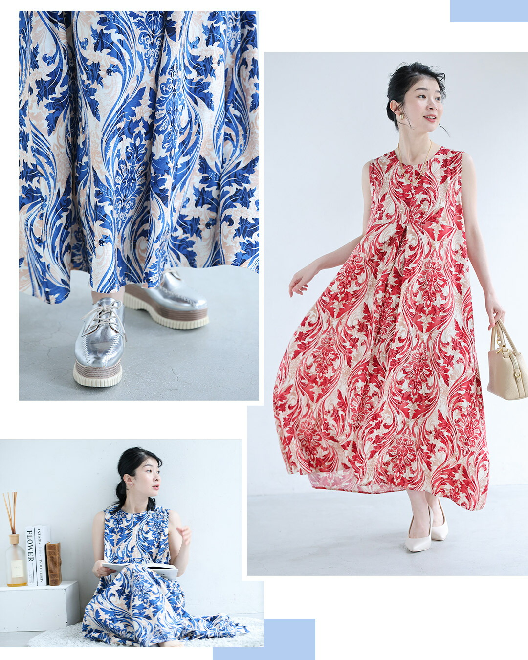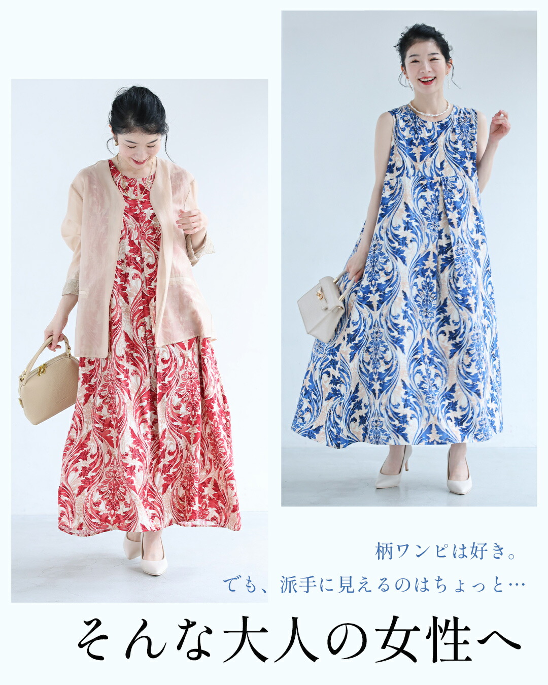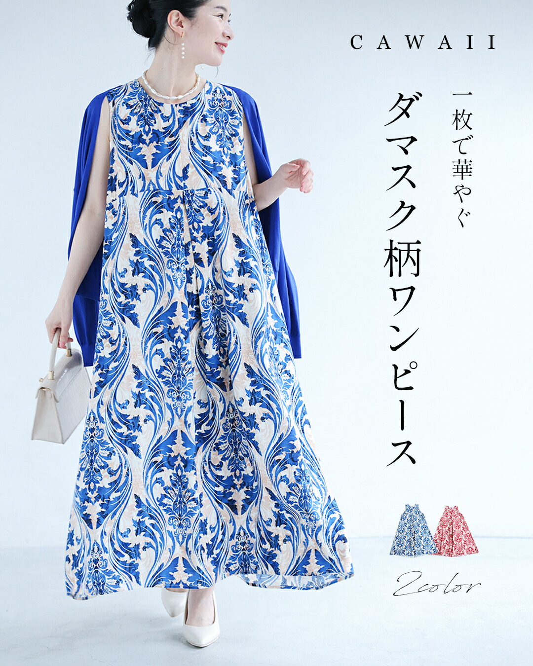 w61696ps 新作 新着 再入荷 CAWAII FRENCHPAVE フレンチパヴェ エレガント ベーシック カジュアル 可愛い かわいい カワイイ おしゃれ オシャレ お洒落 個性 個性的 定番 ベーシック 大人かわいい 大人可愛い 上品 女性らしい デザイン スタンダード ナチュラル きれいめ キレイめ シンプル フェミニン レディース レディースファッション 大人 ママ ミセス 30代 40代 50代 60代 一枚で華やぐ ダマスク柄ワンピース ノースリ 袖なし S M L XL 3L ワンサイズ フリー 小さめ 小さい 低身長 痩せ ほっそり 小柄 細身 標準サイズ 大きめシルエット 大きい ビッグシルエット ゆったり F サイズ自由 薄手 涼感性 涼しい ずずしい 春 夏 春服 春物 夏服 夏物 トレンド 大人女子 体型カバー 楽 ブルー レッド 赤 柄 総柄 日常使い デイリー おでかけ リゾート 旅行