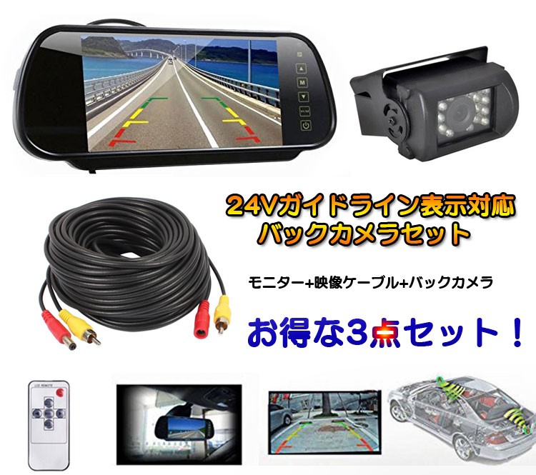 重機、バス、トラック対応 バックカメラセット 12-24V対応 7インチ高輝度ルームミラーモニター 20m配線付き 防水 赤外線バックカメラセット RM71SET