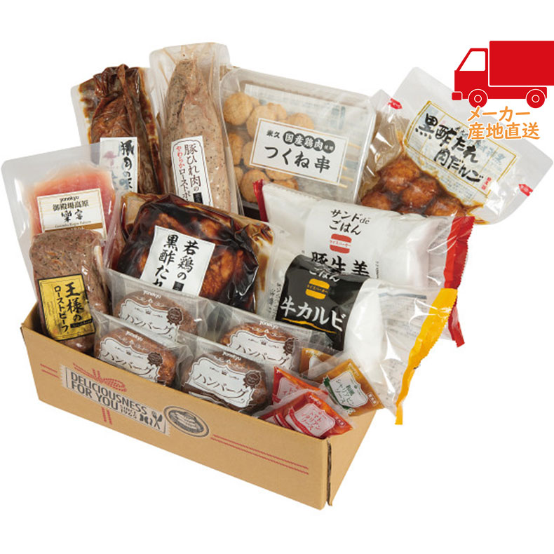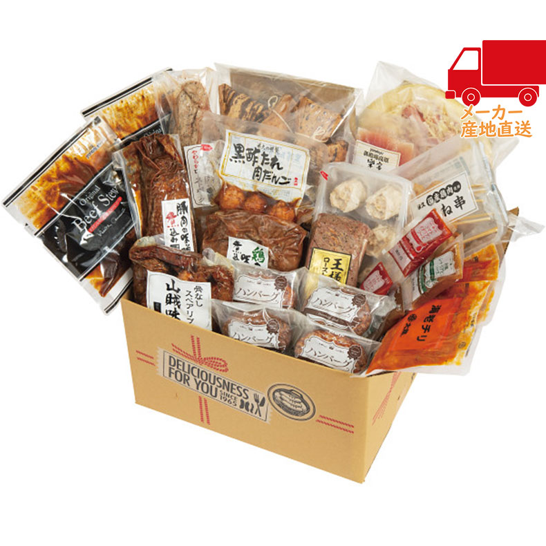 ●王様のローストビーフ200g×1、ハンバーグ(牛肉・豚肉使用)130g×4、和風シャリアピンソース40g×2、トマトイタリアンソース40g×2、豚ひれ肉のやわらかローストポーク360g×1、黒酢たれ肉だんご300g×1、つくね串210g(6本)×1、豚肉の味噌煮込み450g×1、ロース生ハム67g×1、骨なしスペアリブ(山賊味)350g×1、赤ワイン&地ビール仕込みのビーフシチュー170g×2、ベーコンたっぷり4種のチーズピザ259g×1、鶏肉の味噌煮込み280g×1、六穀豚使用焼売180g(6個)×1、中華ちまき560g(8個)×1、大龍海老チリ130g×2