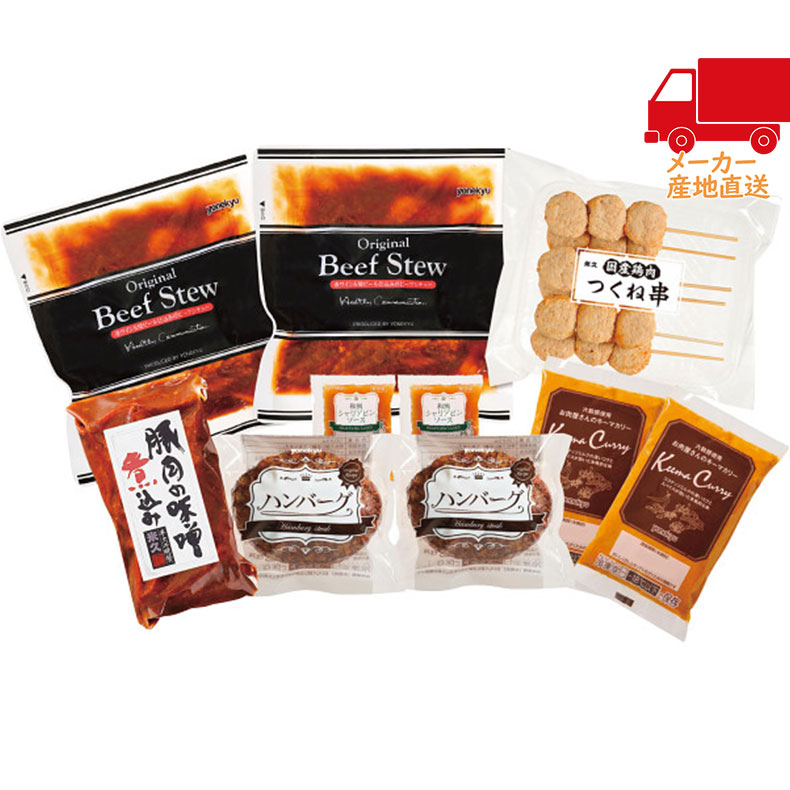 ●ハンバーグ(牛肉・豚肉使用)130g×4、トマトイタリアンソース40g×2、洋風デミグラスソース40g×2、国産野菜とお肉の徳用餃子360g(20個)×1、黒酢たれ肉だんご300g×1、大龍中華ちまき420g(6個)×1、豚肉の味噌煮込み210g×1、大龍海老チリ130g×1、赤ワイン&地ビール仕込みのビーフシチュー170g×2、つくね串210g(6本)×1、豚肉の和醤煮込み210g×1、大龍酢豚180g×1