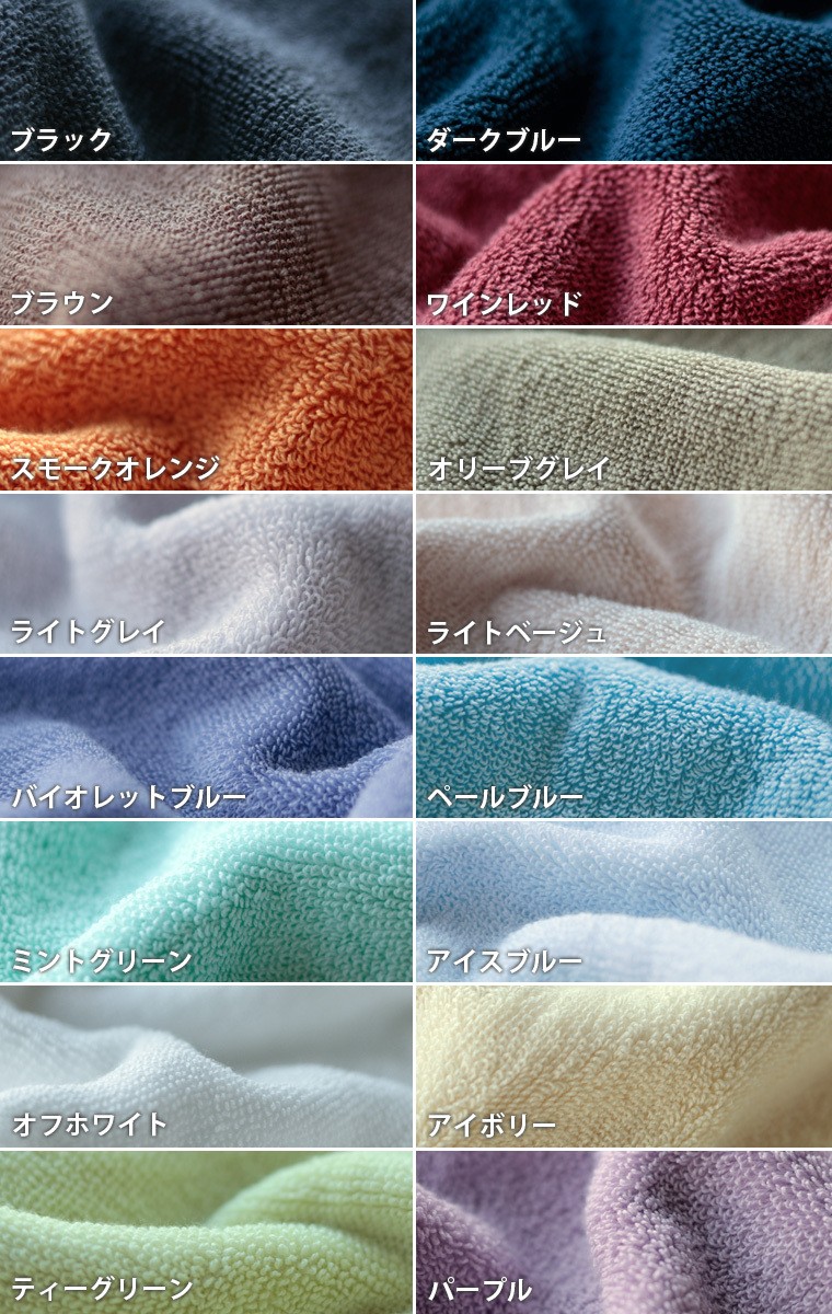 洗濯の回数を重ねても色落ちがしにくく丈夫に仕上がるスレン染料で染色。深みのあるカラーの16色展開で大人向けタオルシリーズです。
