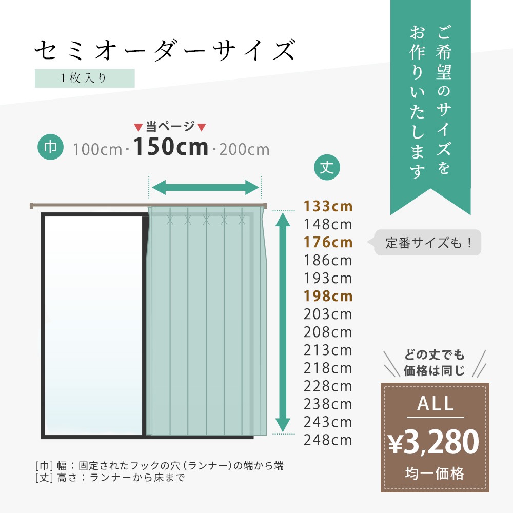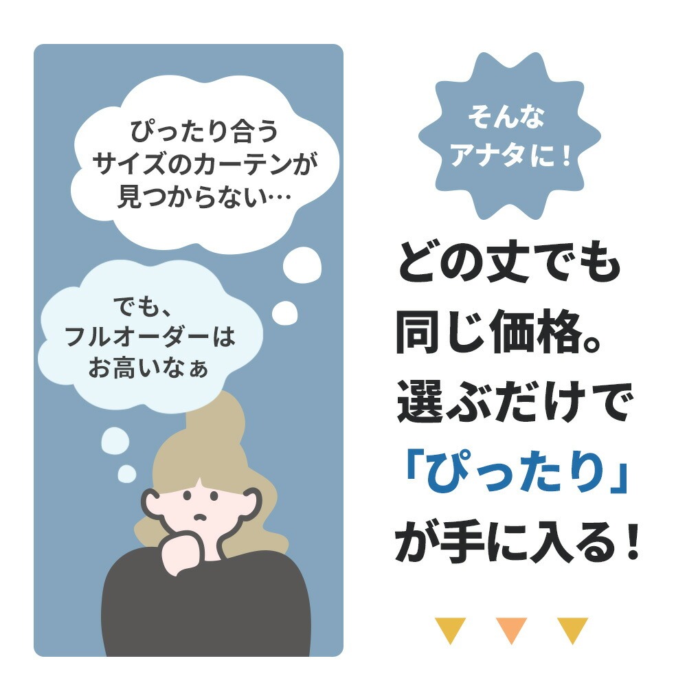 「サイズが合わない」「フルオーダーは高い」とお悩みの方にぴったり。丈が変わっても価格はそのまま、選ぶだけで自分に合ったサイズのカーテンが手に入るセミオーダータイプです。