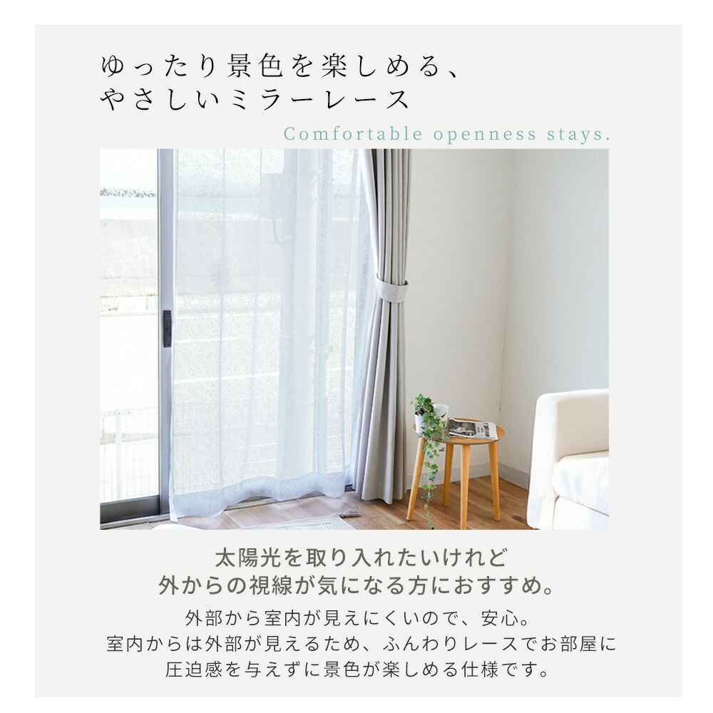太陽光を取り入れつつ、外からの視線をしっかりカット。裏面に光沢糸を編み込むことで太陽光を反射し、昼間のプライバシーを守ります。室内からは外の景色を楽しめるため、開放感も保たれた快適な空間を演出します。