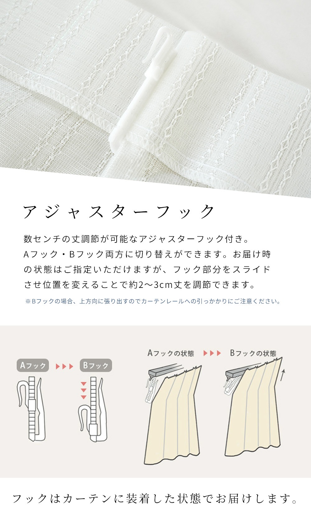 Aフック・Bフック両対応で、約2〜3cmの丈調整が可能なアジャスターフック付き。フックはすでにカーテンにセットした状態でお届けするので、届いてすぐ使えます。