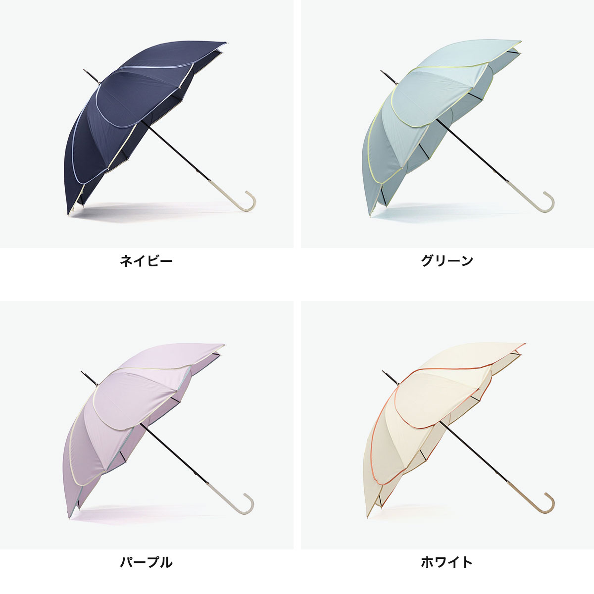 パッと傘を開くと花びらのようなシルエットが美しい長傘。晴雨兼用なので雨の日も紫外線が強い日も活躍!花弁が折り重なったようなデザインは、女性らしい可憐な印象を与えます。