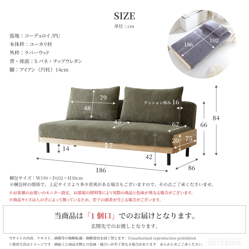 ソファ:W186×D86×H66(SH42)cm