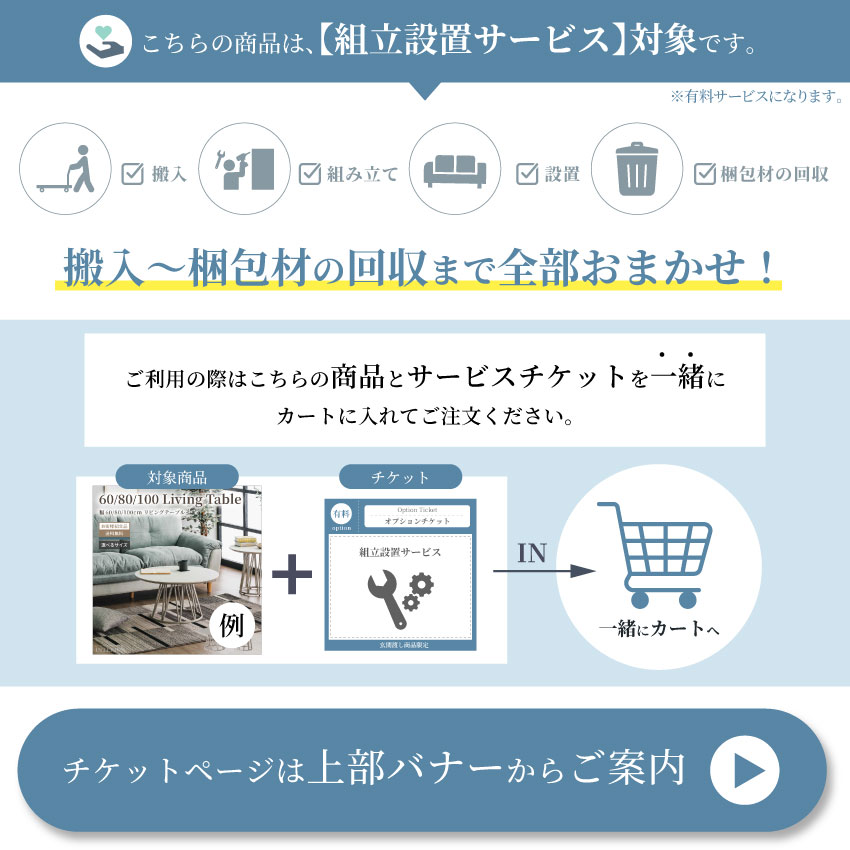 (組立て作業、ご指定の場所へ設置、梱包材の持ち帰りも全ておこないます。)