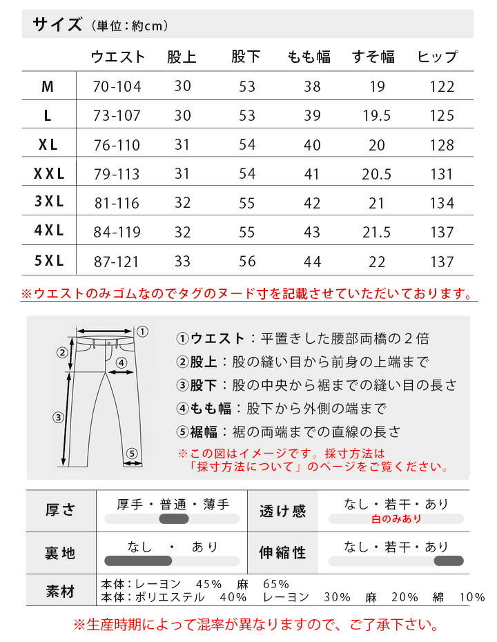 4XL : ウエスト84-119cm 股上32cm 股下55cm もも幅43cm 裾幅21.5cm ヒップ137cm