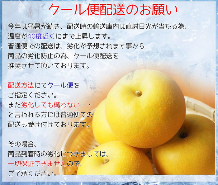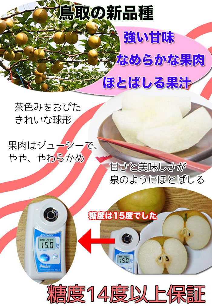 ■コメント: 平成20年2月に登録された新品種です。早生の赤梨で、大玉・高糖度で酸味が少ないのが特徴です。【ご注意】こちらの品種は大変糖度が高い為、お届け日が食べごろとなります。日持ちは出来ませんので「冷蔵庫」に入れてなるべく早めにお召し上がりください。また、稀に下記の症状が報告されておりますのでご到着日・お受取りの際にご確認をお願い致します。お受取日から2日以上の物は対応出来かねますのでご注意ください。「芯腐れ」(しんぐされ)とは、梨が中身の芯の部分から腐っていく症状です。選果には、細心の注意を払っておりますが、見た目がきれいな梨であっても、芯の傷みは外面からは見分けることができず配送時に傷みが進んでしまうことがあります。約15万個の梨のうち300個程度、傷みのある梨があるようです。生鮮品ですので割合としては少ないものの、どうしてもこのような梨が発生します。