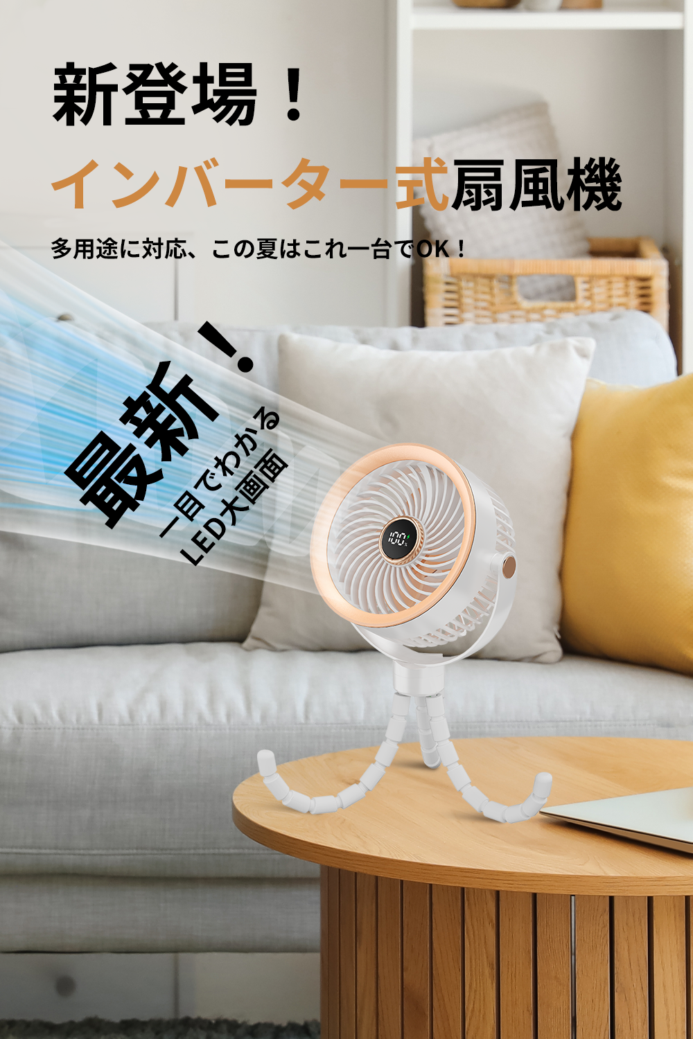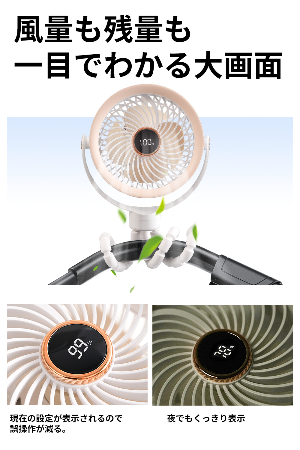 携帯扇風機 急速充電 大風量 瞬間冷却 ベビーカー対応 最新LED大画面 5WAY くねくね三脚 卓上 USB充電式 ハンディファン 吊り下げ 巻き付け スタンド コンパクト