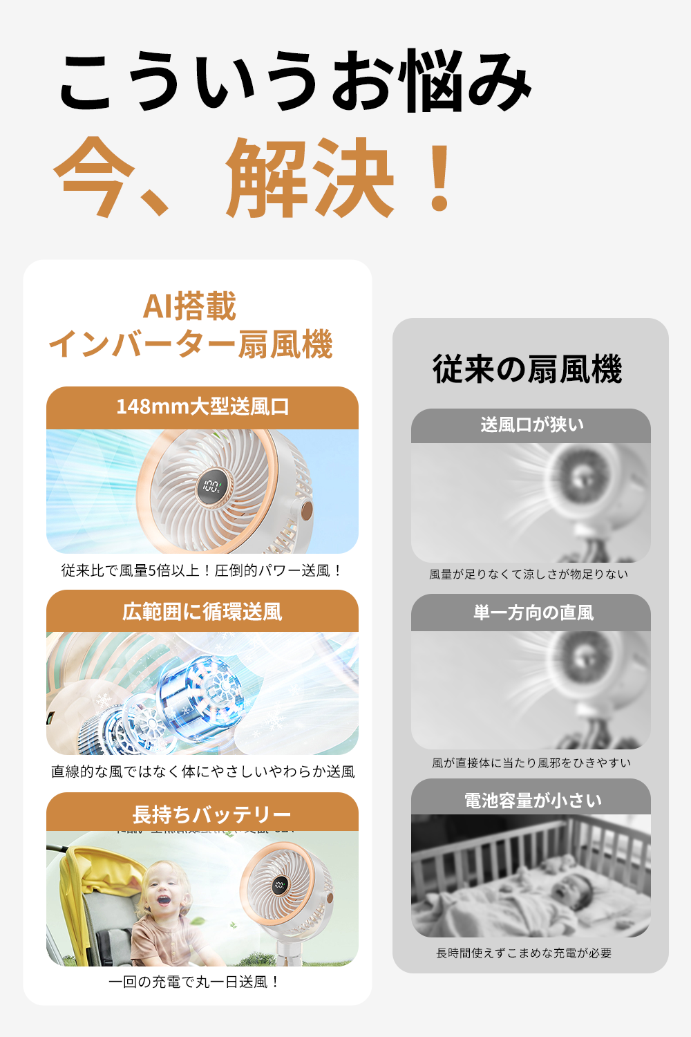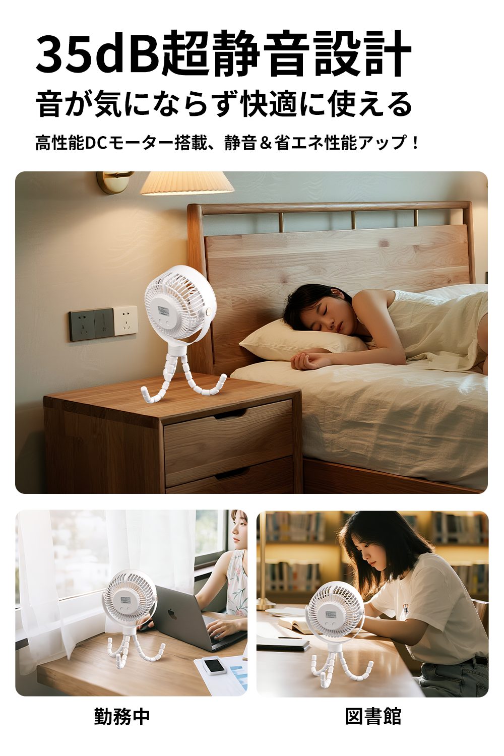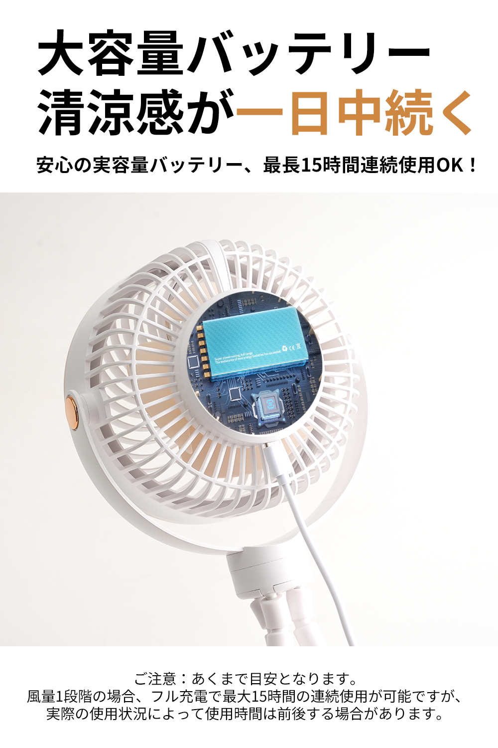 大容量バッテリー搭載で最大15時間連続使用が可能。35db以下の静音設計で就寝時や赤ちゃんのそばでも安心。指はさみ防止機能と高品質素材で安全性にも配慮しています。