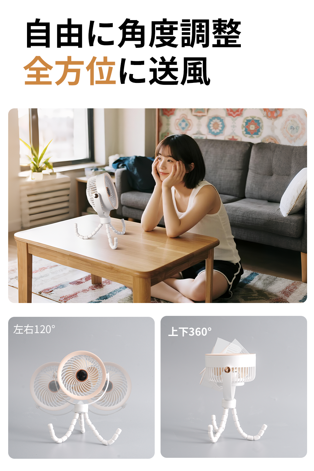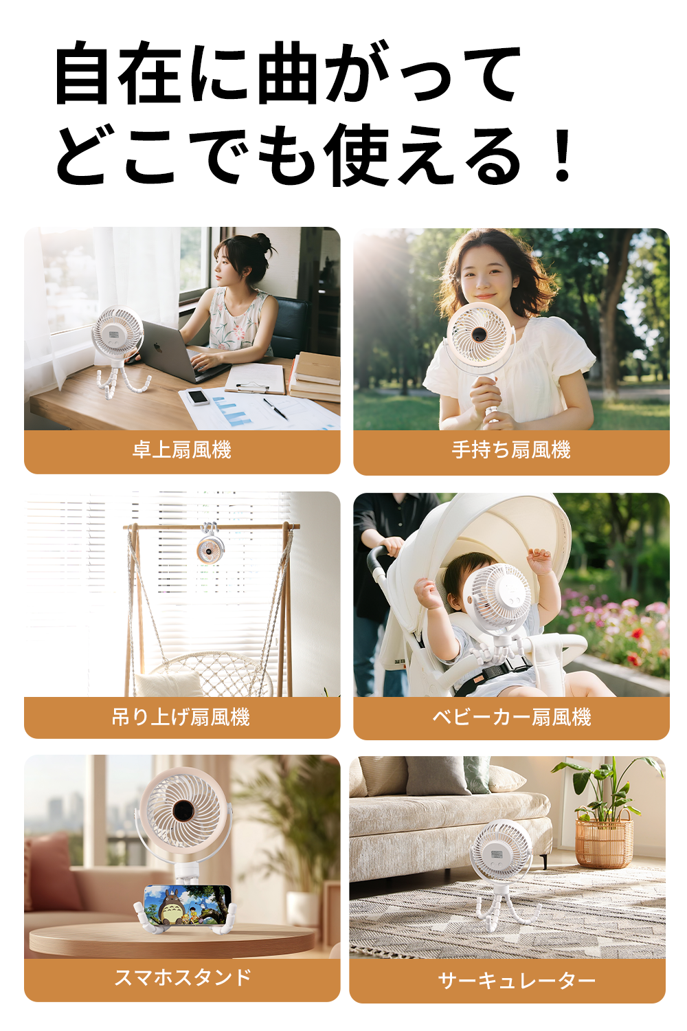 卓上・手持ち・吊り下げ・巻き付け・スマホスタンドの5WAY仕様。くねくねと曲がる三脚で自由自在に設置可能。ベビーカーや自転車、ジム、車中泊、アウトドアなど様々なシーンに対応します。