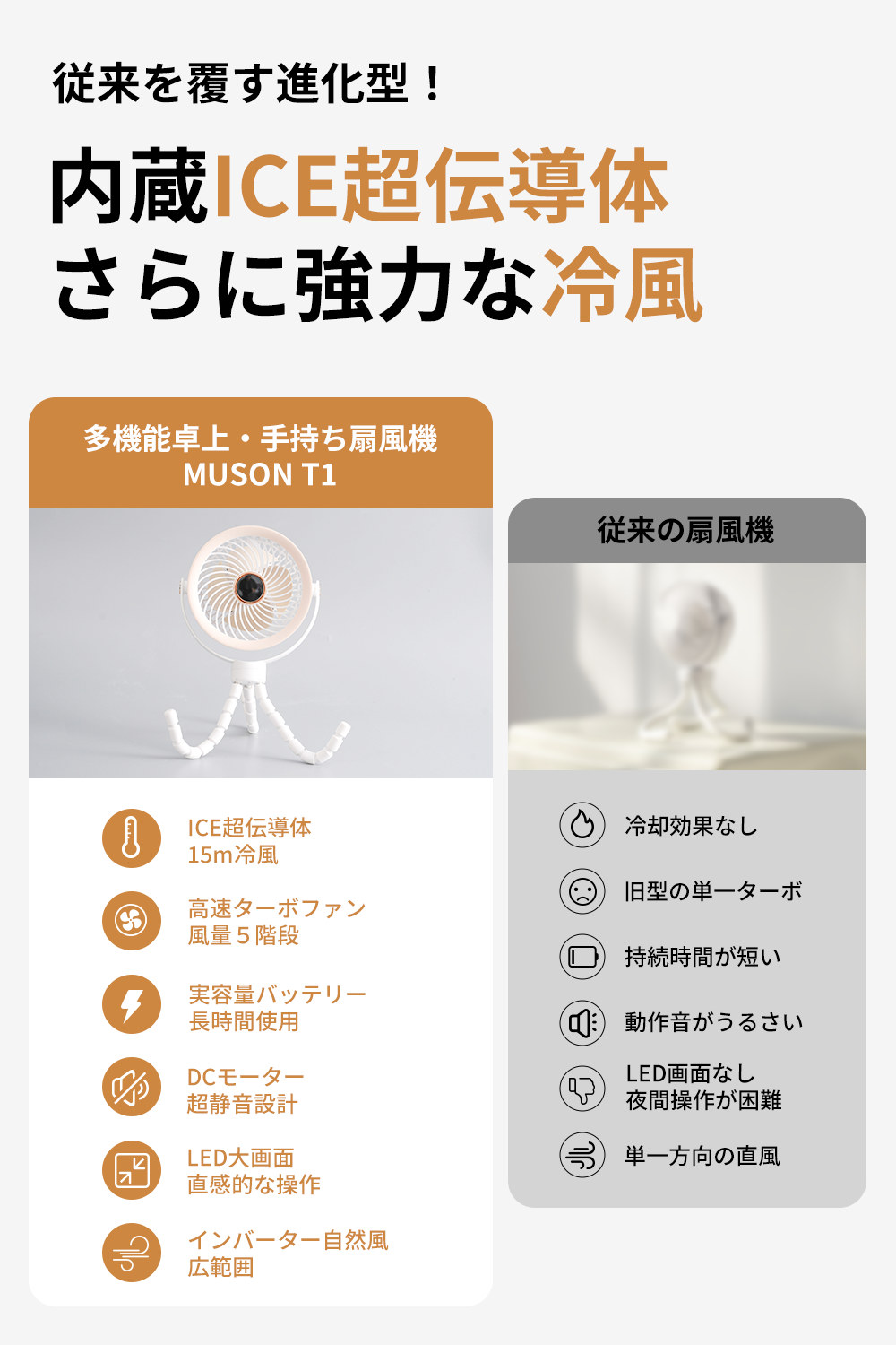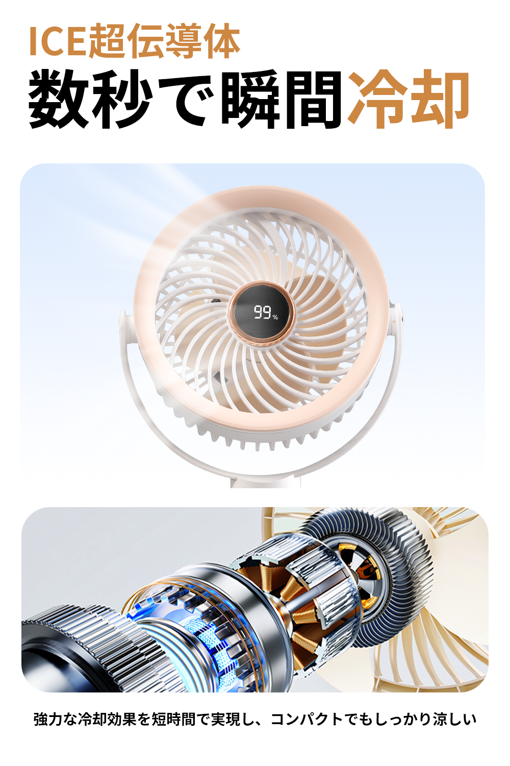 内蔵された最新ICE超伝導体がただの風を瞬時に冷風に変換。体温を効率的に下げ、猛暑や熱中症対策に最適です。夏の屋外や車中泊、アウトドアシーンに大活躍!