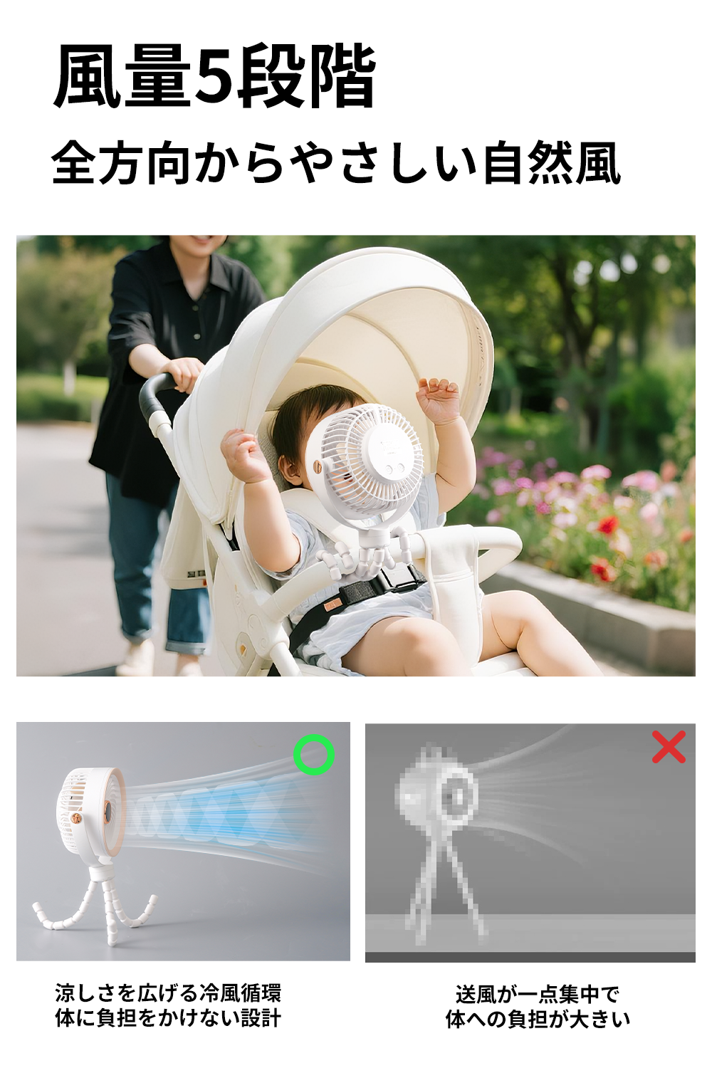 大型の送風口と螺旋状の設計により、風を均一に分散。遠くまでパワフルに風を届け、ベビーカーや車内、キャンプ場でも快適な涼しさを実現します。