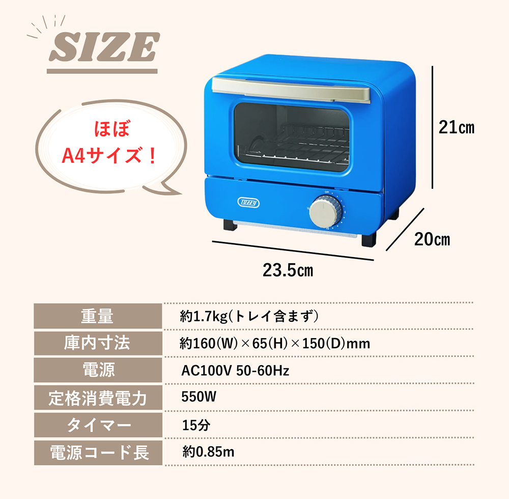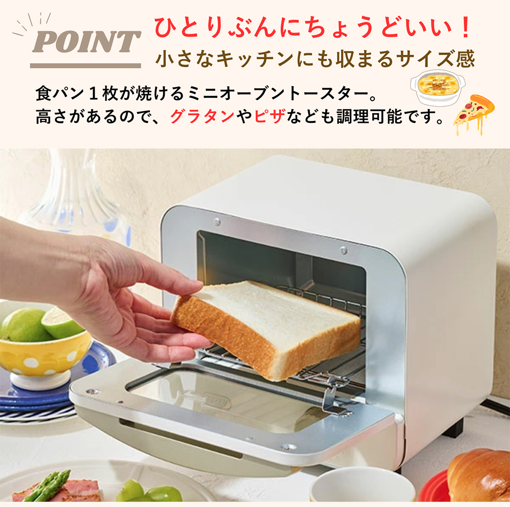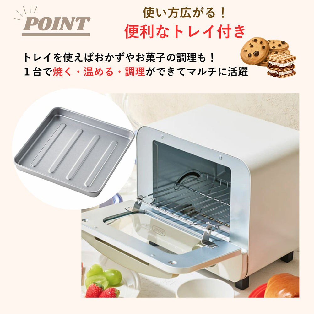 食パン1枚がすっきり入って、かさばらないミニサイズのかわいい卓上トースター。 小型でもしっかり加熱できるので、ボリュームのある総菜などの温め直しもでき、付属のトレイを使用すれば、トースト以外のさまざまな料理にも活用できます。