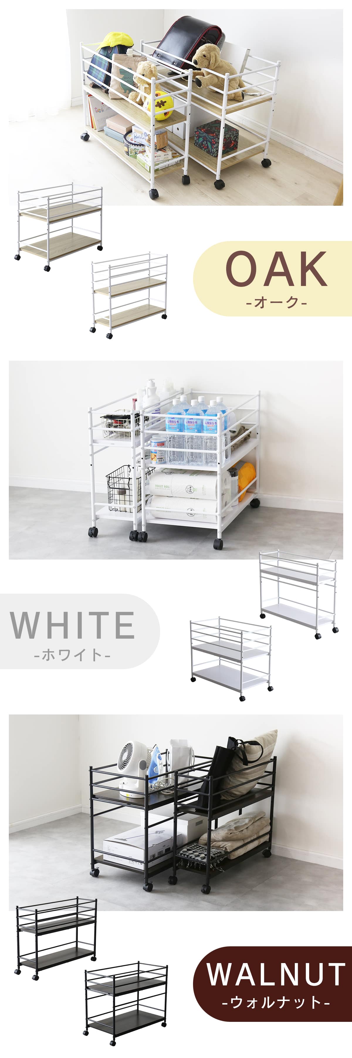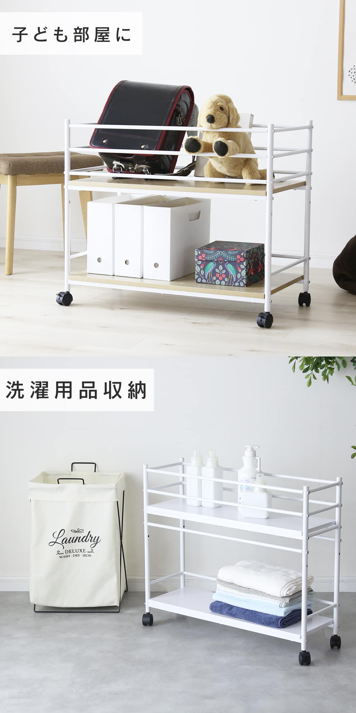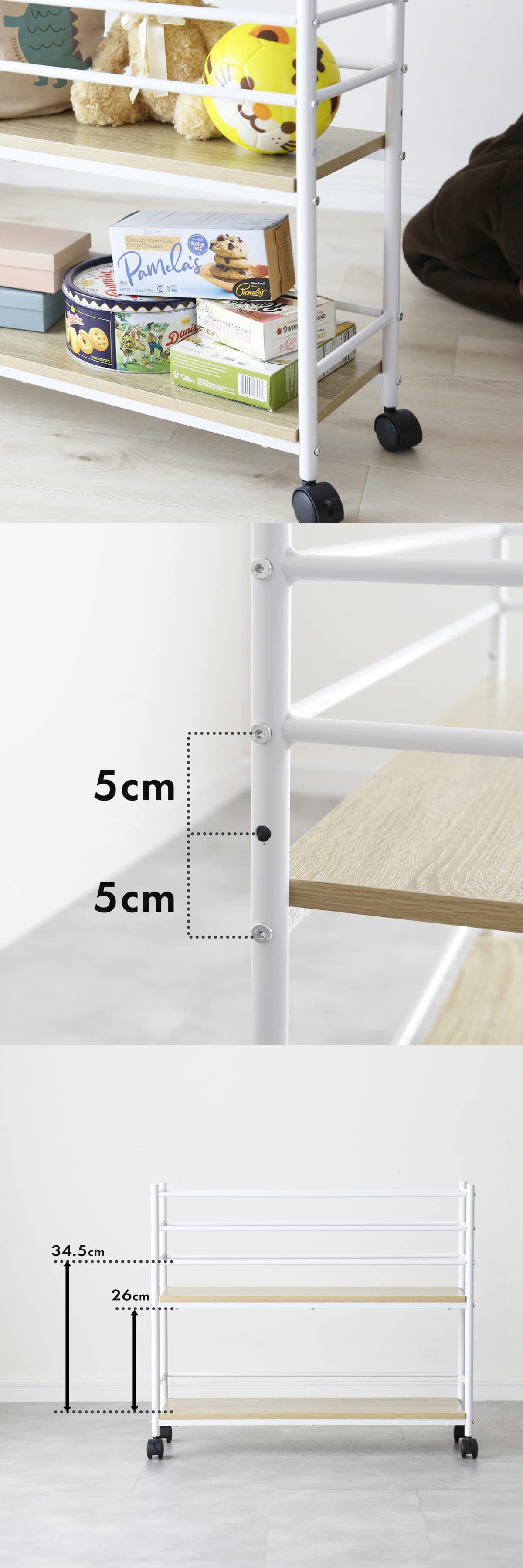 収納するものに合わせて棚板の位置を3段階で調整できる棚板を採用。子どものランドセルや教科書を収納したり、一人暮らし女子のファッション小物をディスプレイしたりと、使い方はあなた次第。リビングや寝室、洗面所、玄関など、どの部屋でも整理収納をサポートします。日常生活をよりスマートに、おしゃれに整える高さ調整可能ワゴンです。