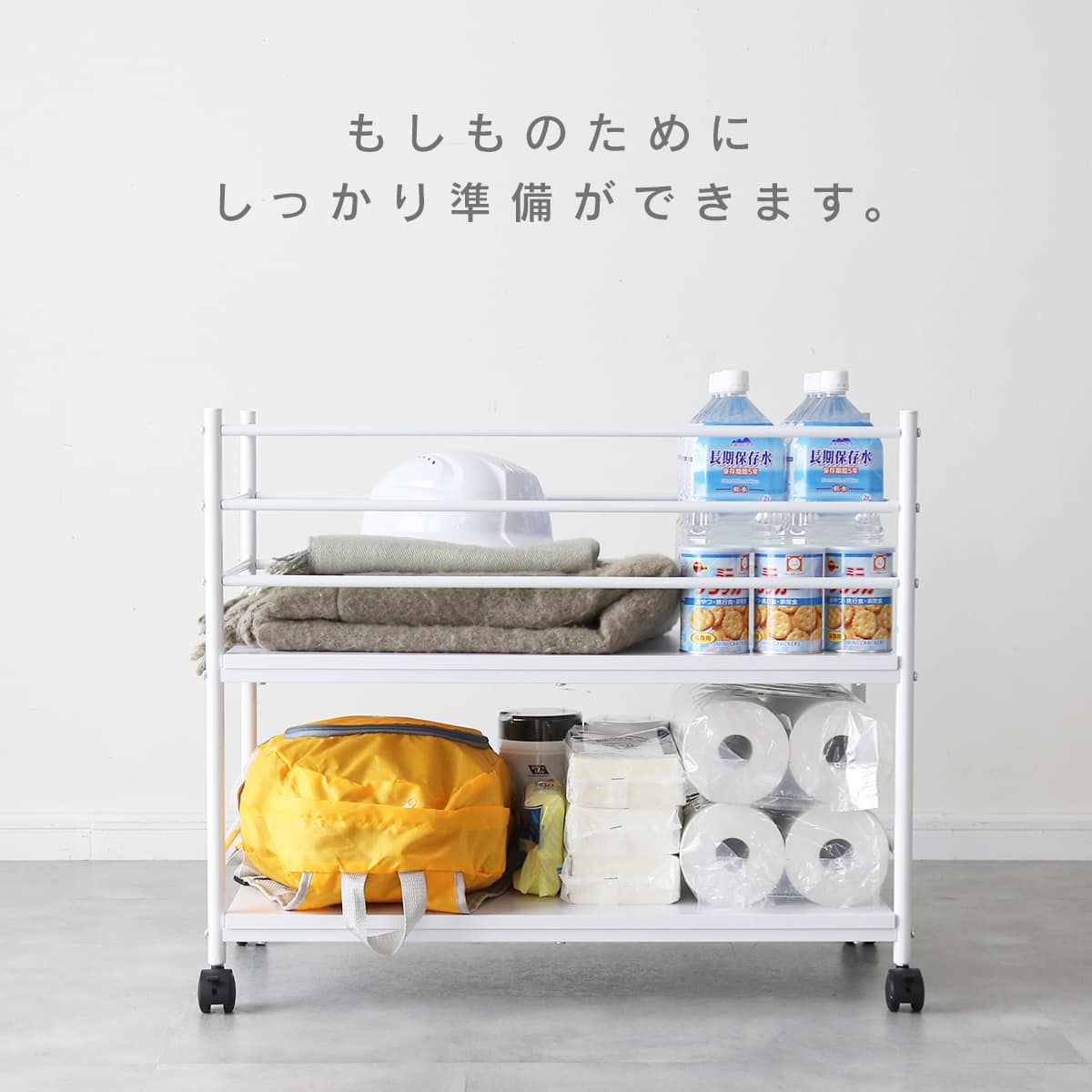 見た目がスタイリッシュなだけでなく、防災用具をまとめて収納するのにもぴったり。シンプルなデザインでどんなお部屋にもマッチします。キャスター付きなので、いざという時にもサッと取り出せる実用性も魅力。普段はクローゼットや押入れの中にしまっておいても、必要な時にすぐ使える安心感をお届けします。