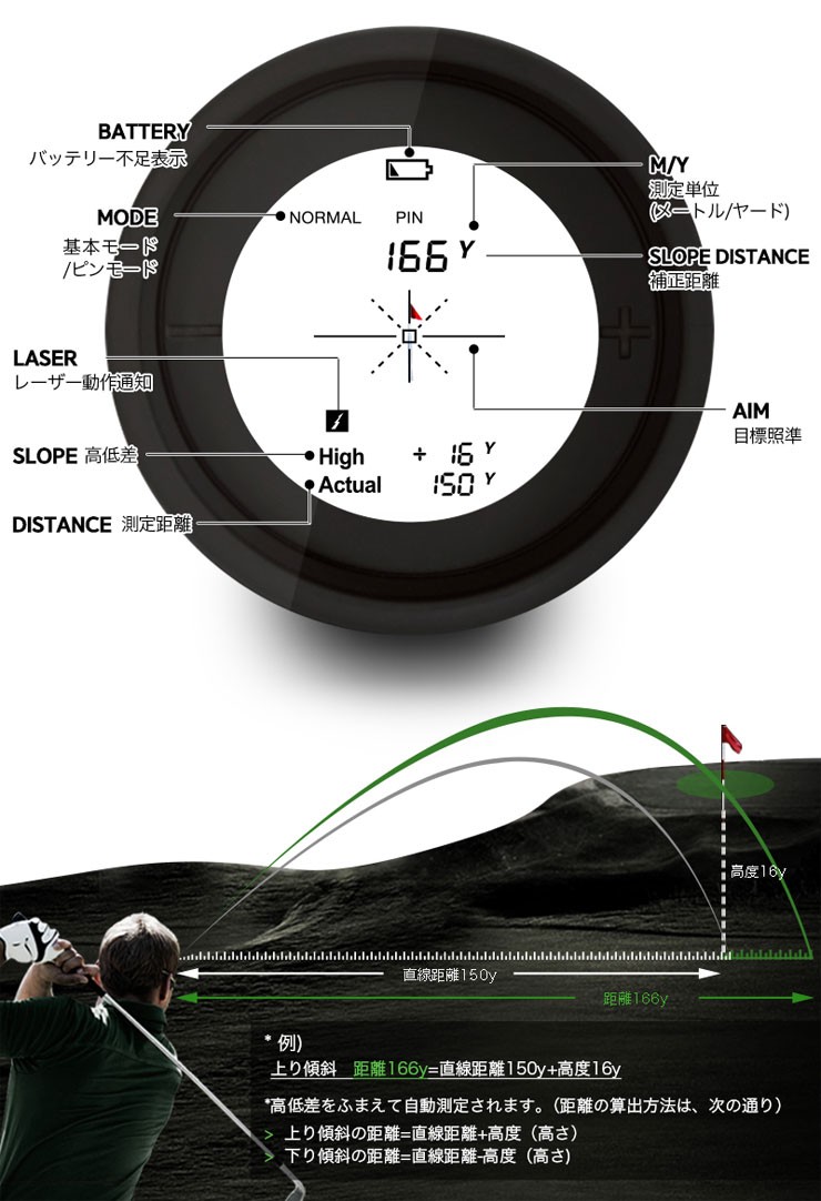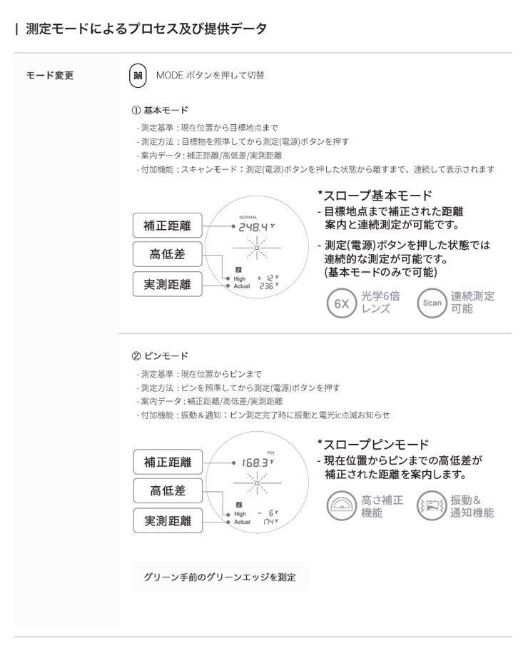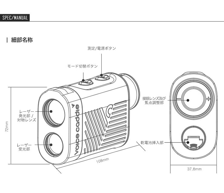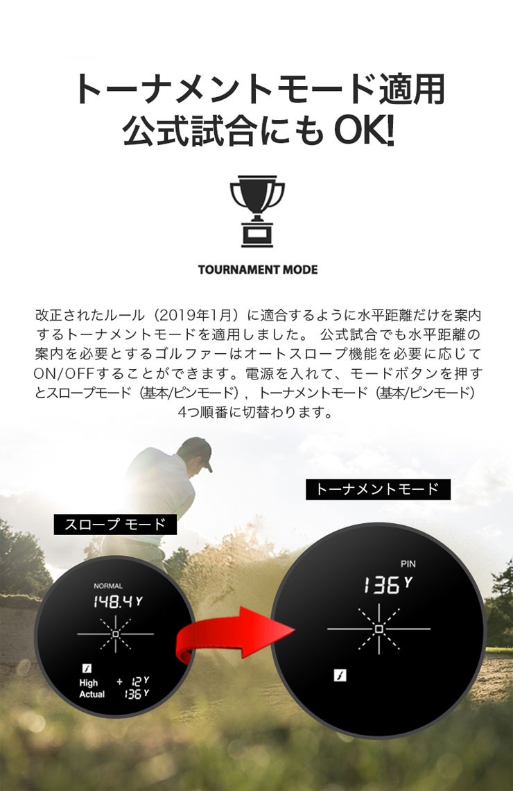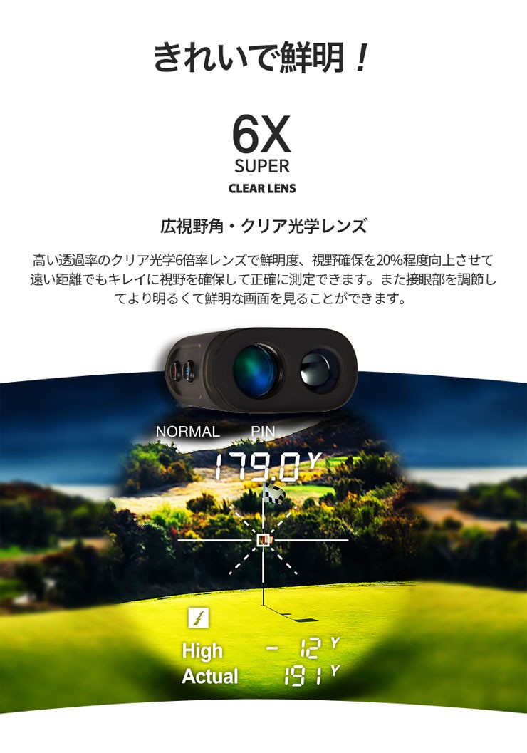 《商品説明》【主要機能】■ワンタッチ・ピンモード■ディテクティング・ブースター■コンピューティング・パワー精密測定■クリア光学レンズオートスロープ■連続スキャン■振動通知【光学倍率】6X【測定範囲】5ヤード1000ヤード(1ヤード=0.91m)【誤差範囲】1ヤード以内【レーザ】1クラス【動作時間】約5,000回【バッテリー】リチウムCR2(3V)《サイズ/重量》横37.8mm×縦108mm×高さ72mm/199g(バッテリー除外)《素材》ボディ(ラバー)ボタン(PC)VOICE CADDIE ゴルフナビ レーザー 距離 距離計測器 距離測定器 ゴルフ ラウンド オシャレ オートスロープ 連続スキャン ボイスキャディー 高低差 トーナメントモード ルール適応 測量 振動 通知 精密測定 クリア光学レンズ 爆買