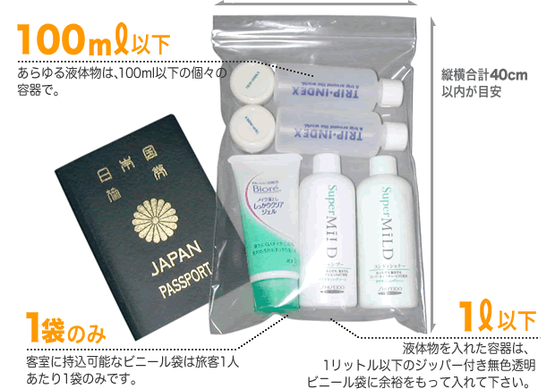 液体物は100ml以下の容器に入れ、それらの容器を再封可能な容量1L以下の透明プラスチック製袋(袋のサイズは縦×横の合計が40cm以内)に余裕を持って入れてください。旅客1人あたり袋の数は1個で、機内持込みが可能となります。