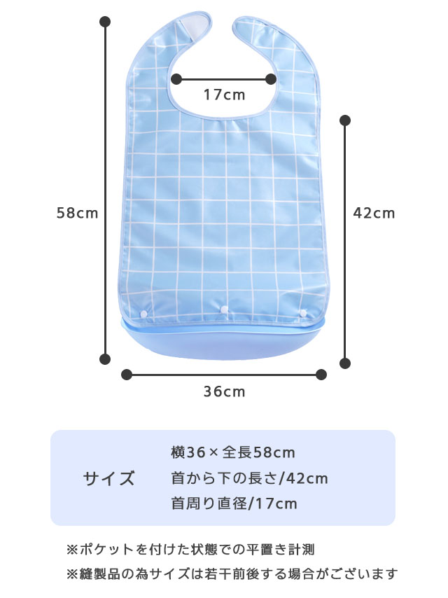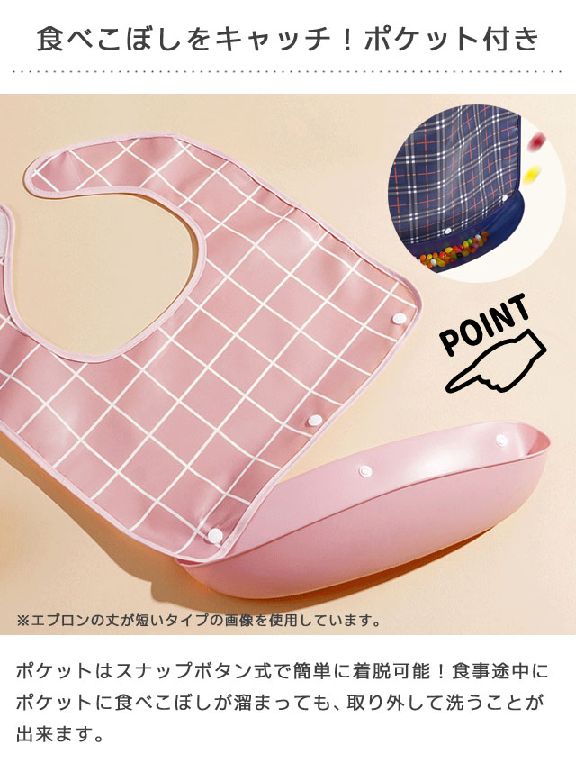 ポケットはスナップボタン式で簡単に着脱可能!食事途中にポケットに食べこぼしが溜まっても、取り外して洗うことが出来ます。