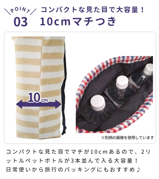 コンパクトな見た目でマチが10cmあるので、2Lペットボトルが3本入るほどの大容量!