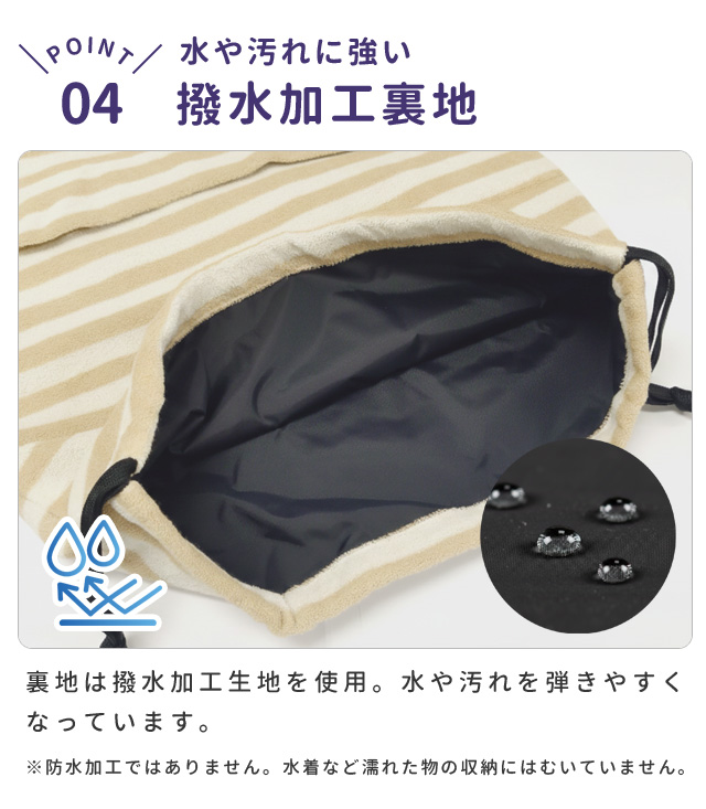 裏地は撥水加工生地を使用。水や汚れを弾きやすくなっています。