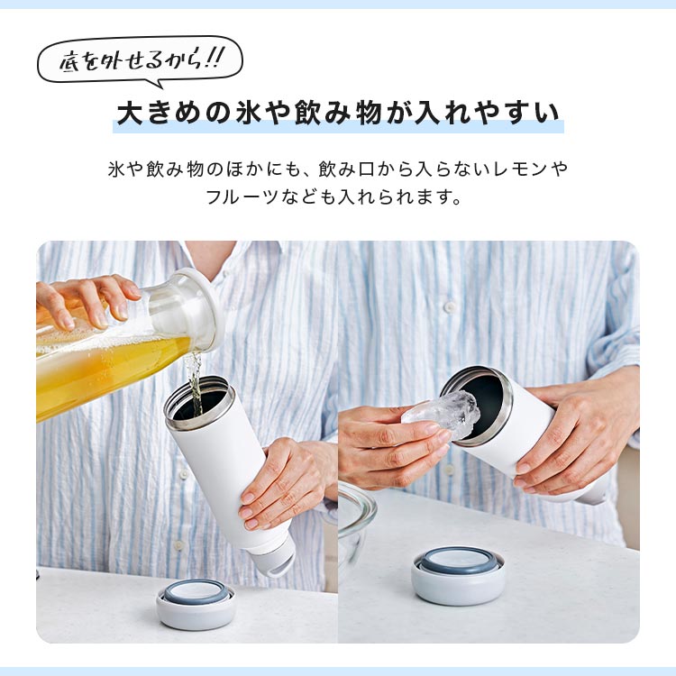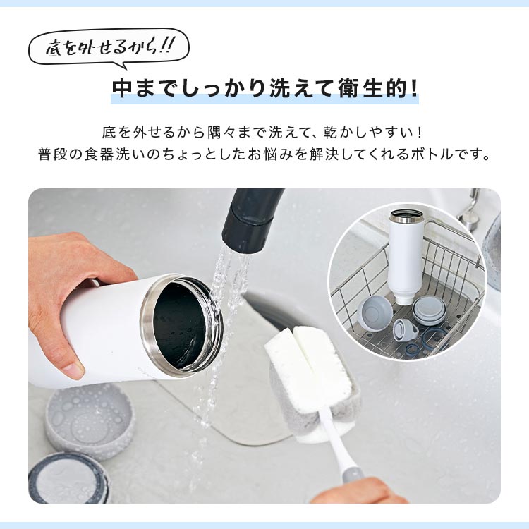 普段の食器洗いのちょっとしたお悩みを解決してくれる、お手入れ簡単なそこまで洗えるボトル!底が取り外せることで、中を隅々までしっかり洗える&乾かせるので衛生的に◎また飲み口から入らない大きめの氷やフルーツなども入れられます。保温・保冷機能に優れたステンレス素材で、飲み物の温度を長時間キープ。超軽量&取っ手付きなので、外出時やオフィスでの移動もラクラク♪日常使いでも馴染む、ペットボトル風デザインがかわいい便利なボトルです。忙しい日常を彩る、あなたの新しいマストアイテムにオススメ!ブランド名