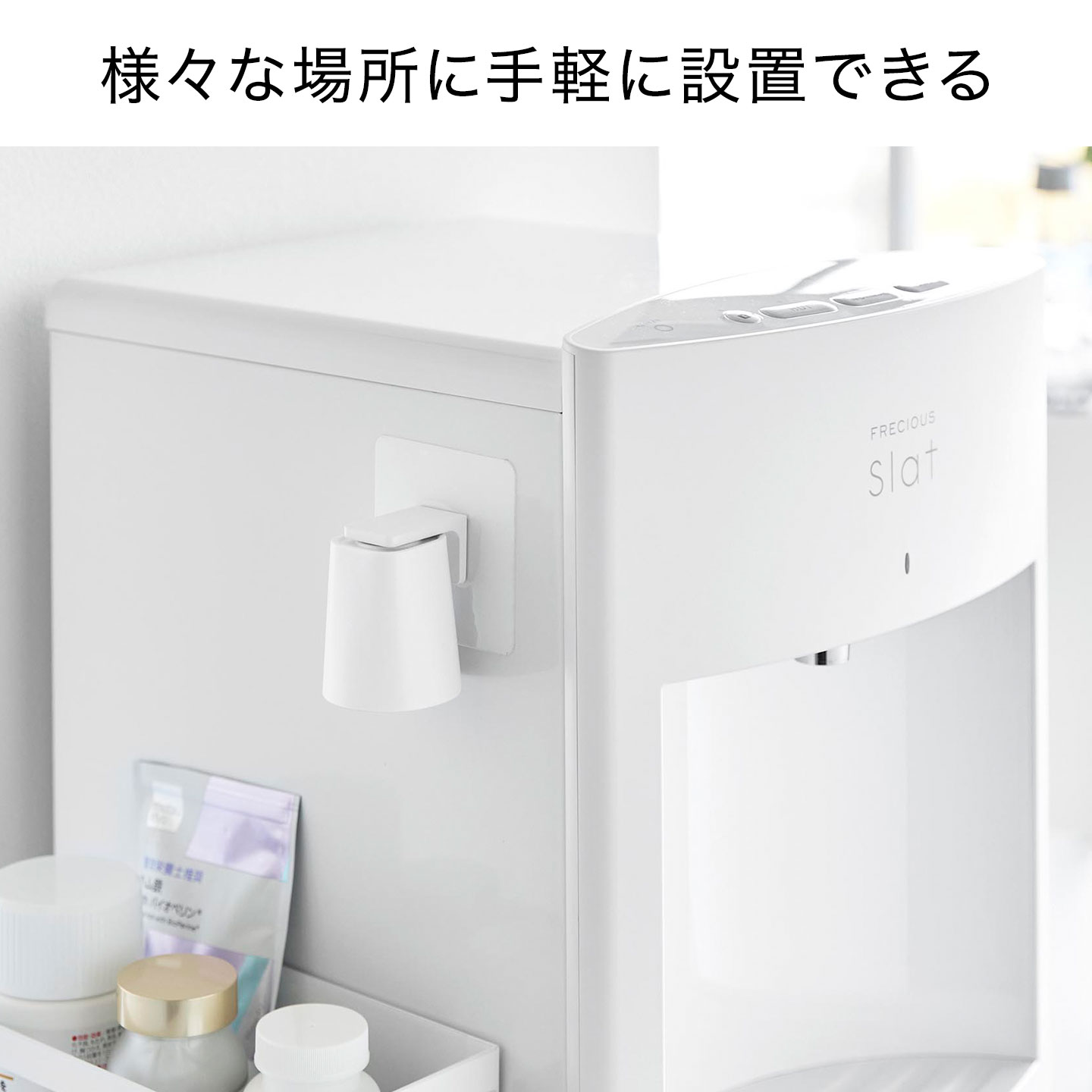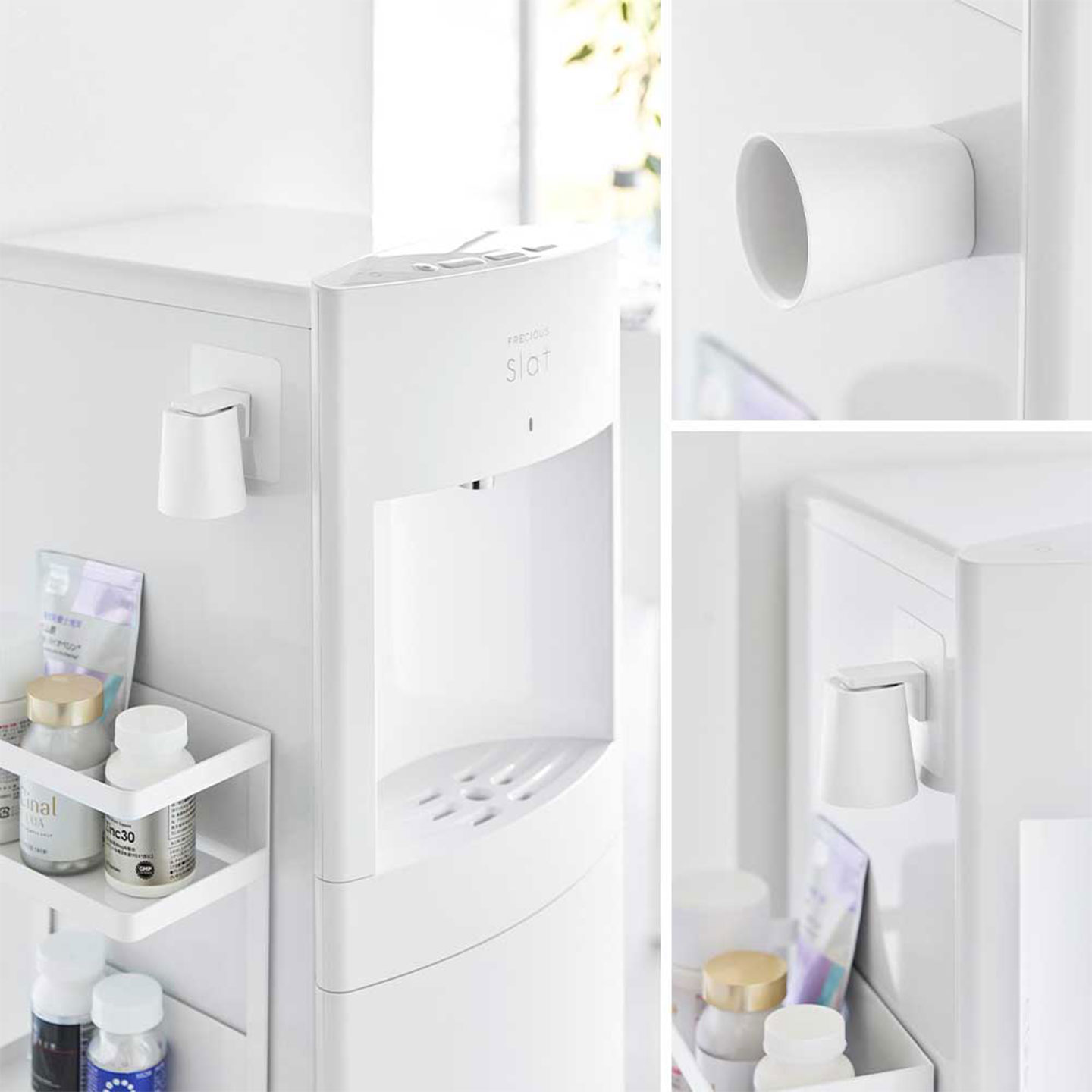 様々な場所に手軽に設置できるウォーターサーバーや冷蔵庫などの側面に設置すれば、薬やサプリメントを飲む時に、タンブラーがすぐ手に取れます。