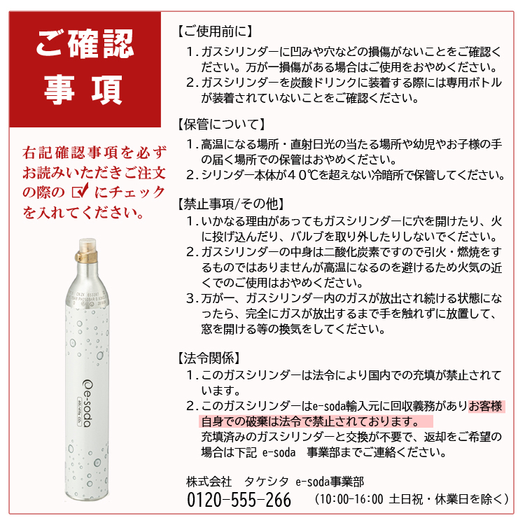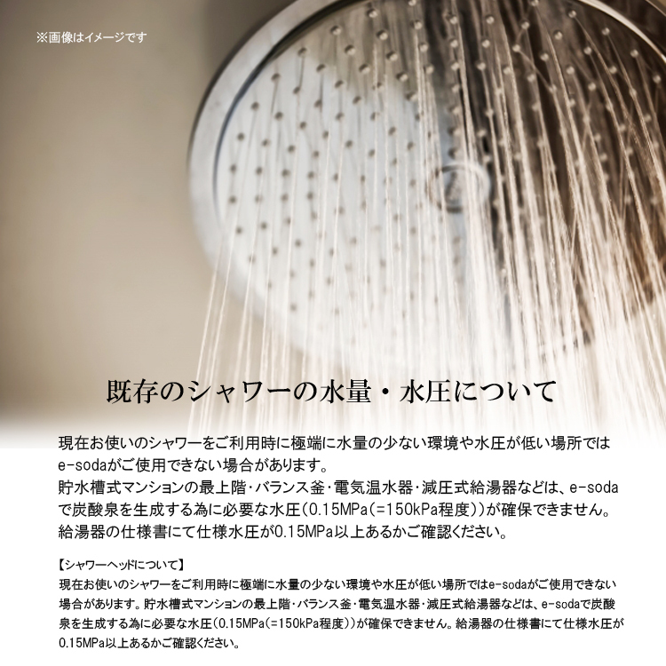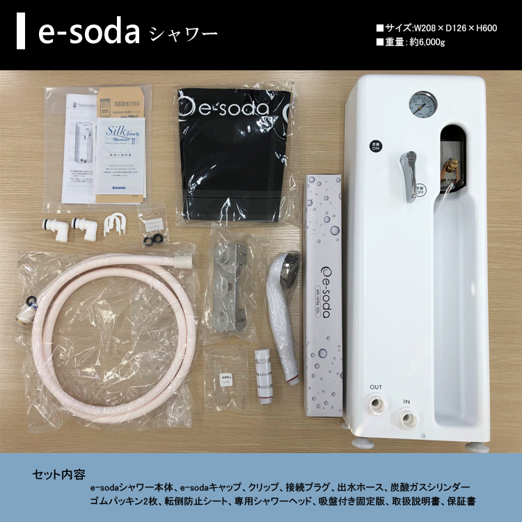 ■セット内容:e-sodaシャワー本体、e-sodaキャップ、クリップ、接続プラグ、出水ホース、炭酸ガスシリンダー、ゴムパッキン2枚、転倒防止シート、専用シャワーヘッド、吸盤付き固定版、取扱説明書、保証書