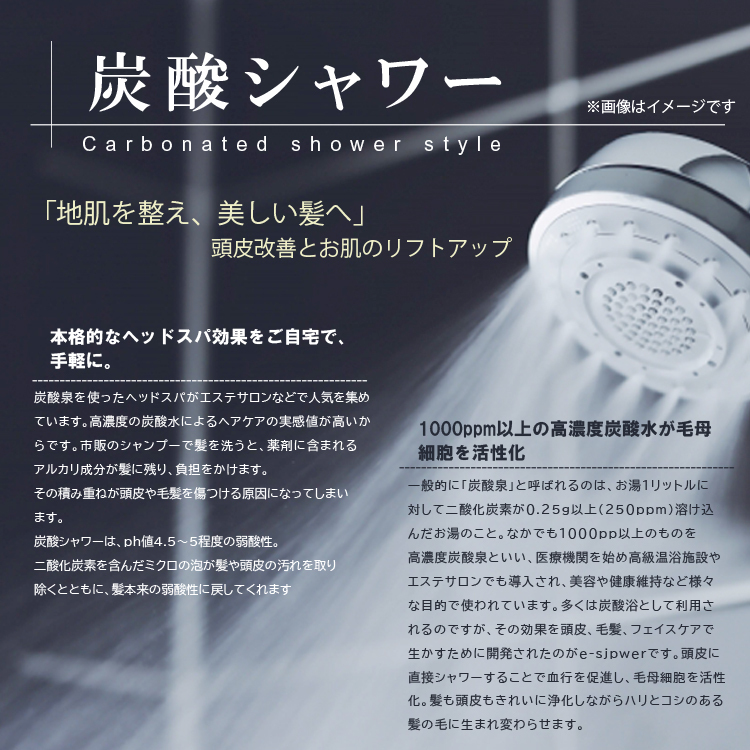●炭酸シャワーがもたらす5つの頭皮毛髪改善効果(1)Vasodilator action「血管拡張」による健康毛髪促進(2)汚れや老廃物を除去するクレンジング効果(3)皮膚と毛穴の引き締め(4)カラー、パーマのクオリティアップ(5)白髪や抜け毛、肌のくすみ防止・切替ハンドルレバー:普通シャワーと炭酸シャワーを切り替える
