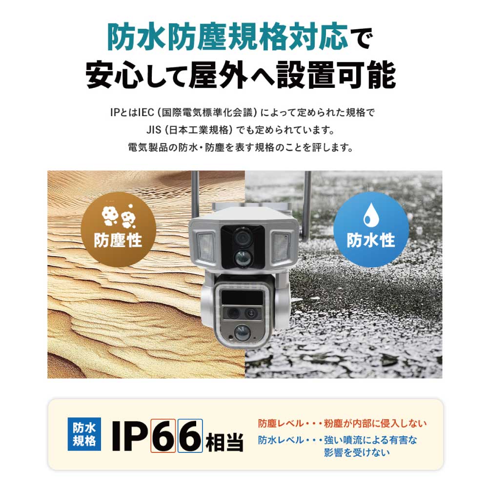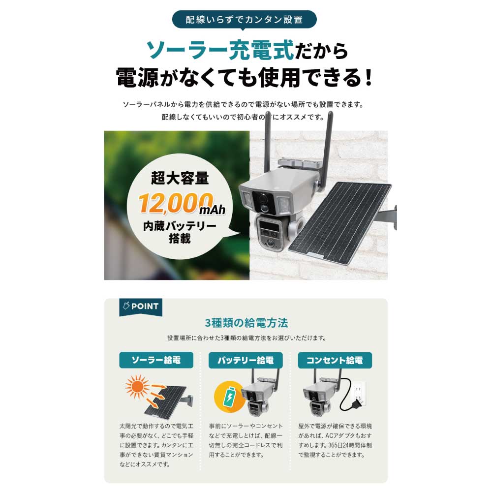 カメラ内部に12,000mAhの大容量リチウムバッテリーを搭載、付属のソーラーパネルで充電しながら使用します。