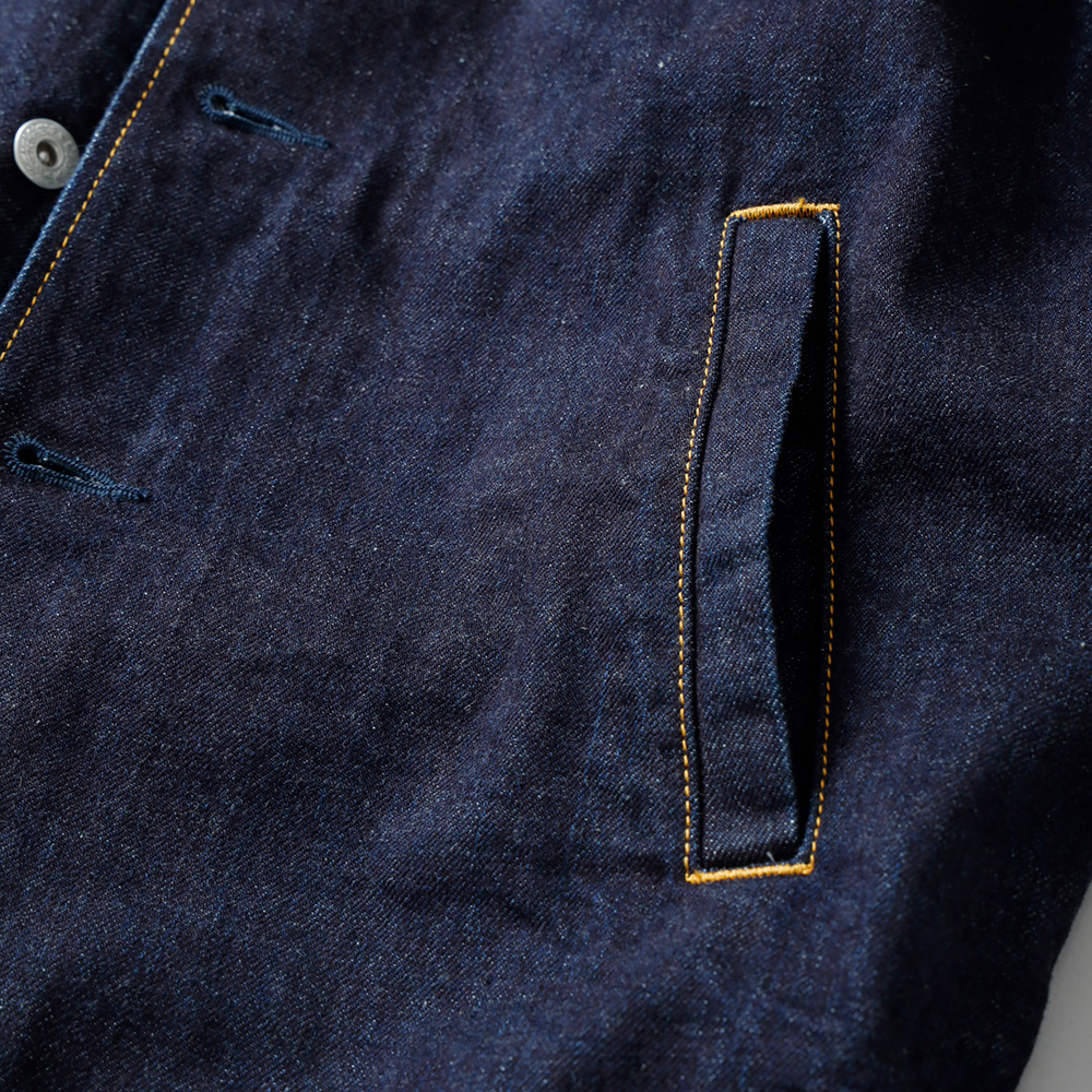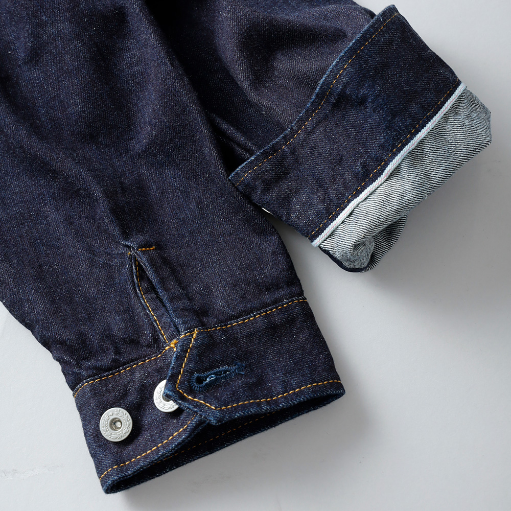 その赤耳部分を前立てや袖口に配し、シンプルなデザインの中に程よいアクセントをプラス。