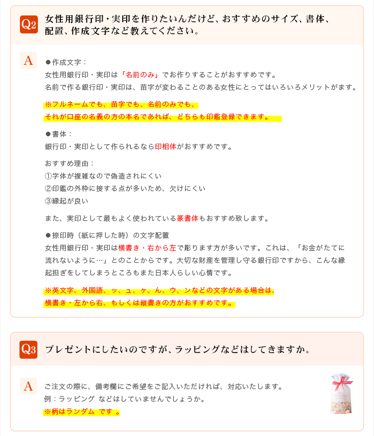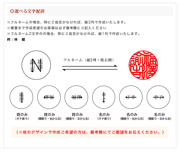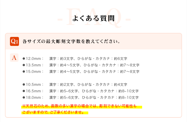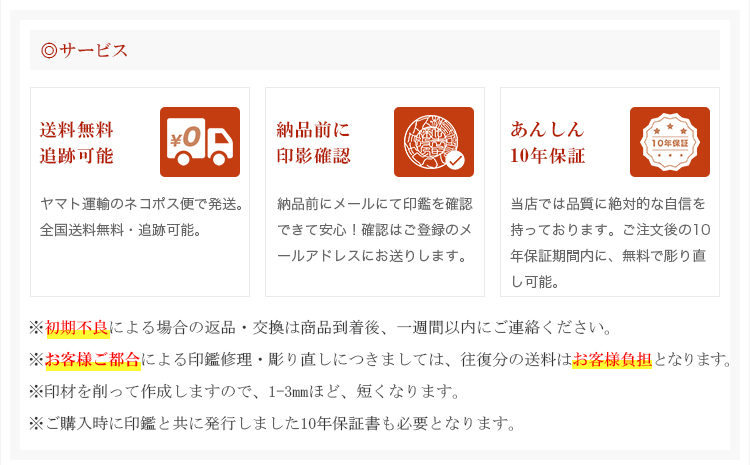 お客様が当店にてお買い上げいただいた印鑑は、ご購入日より、10年以内であれば、無料で彫り直しをいたします。(送料は往復分ご負担ください。)