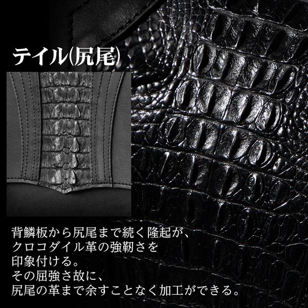 背鱗板から尻尾まで続く隆起が、クロコダイル革の強靭さを印象付ける。