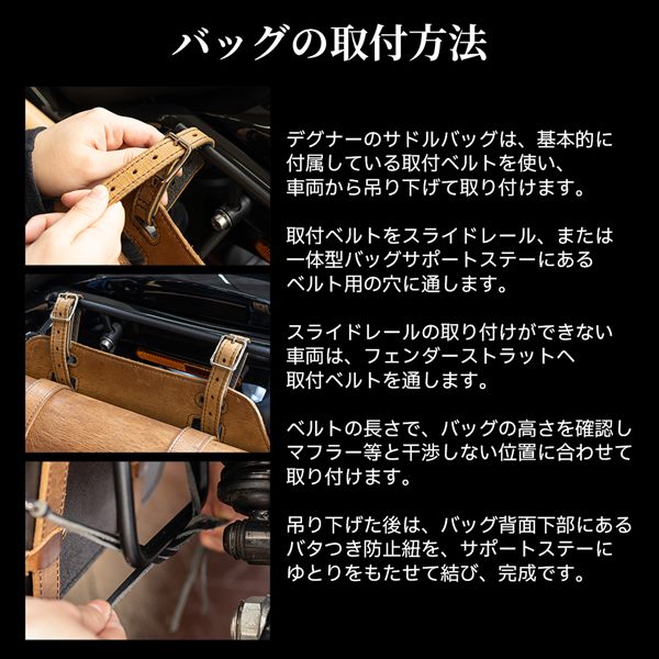 デグナーでは、走行時にタイヤへバッグが巻き込まれる事や、走行中のバッグのバタつきを防ぎ、