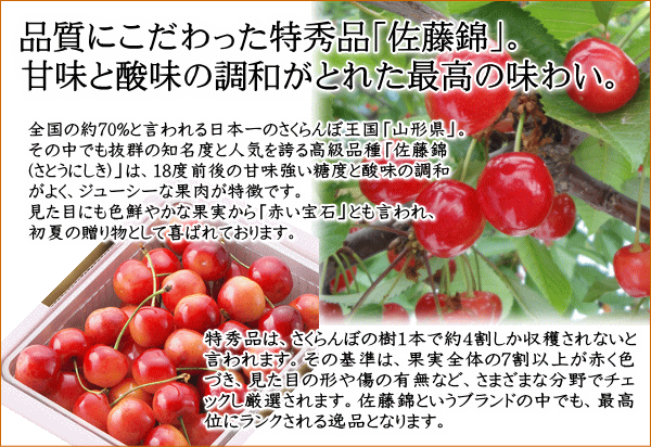 【さくらんぼは全地域「クール便(冷蔵)」でお送り致します(別途クール便代金のご負担はありません)】佐藤錦は甘みが強く酸味との調和がよい山形を代表する人気品種です。ご案内の商品はLサイズ以上の特秀品で、生産農家自ら1粒1粒厳選したこだわりの逸品です。最高級の味わいをお楽しみ下さいませ。【ご贈答用にもオススメ】※商品配達は6月17日〜7月2日の間で順次お届けとなります。