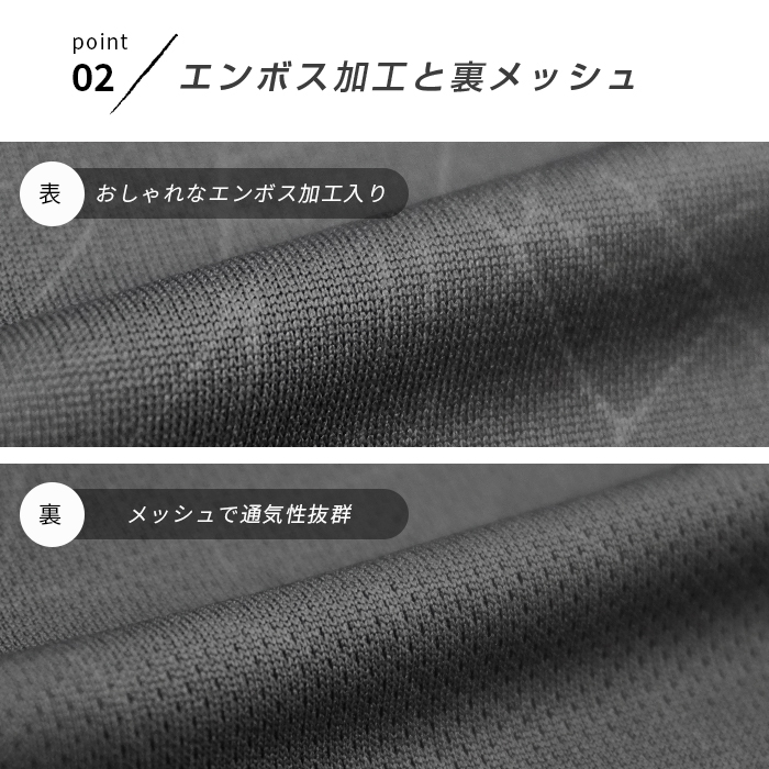 表面はおしゃれなエンボス加工、裏面は通気性に優れたメッシュ仕様でムレを軽減◎