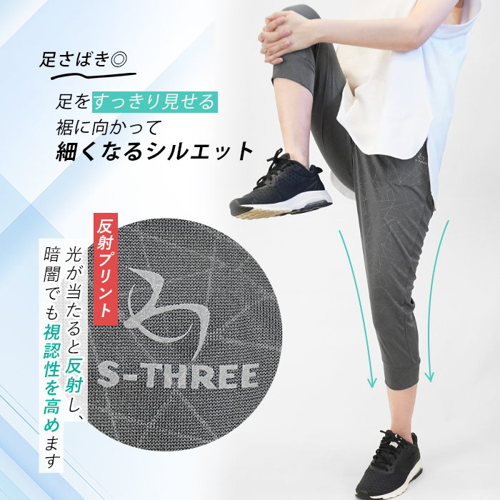 足元に向かって細くなるスリムなテーパードシルエットは足さばきが良く、ランニングやウォーキング中ももたつかずに軽やかに動けます。